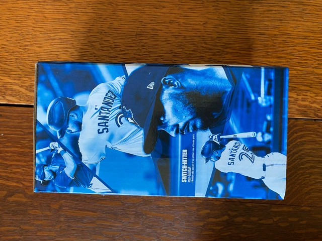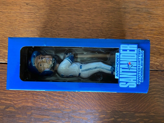 This Anthony Santander Blue Jays bobblehead is new in the box. A great piece for any Jays fan's collection! It's just waiting for a new home where it can bring joy and spark conversations, or maybe just nod approvingly from a shelf. If the ad is still up, it's still available!