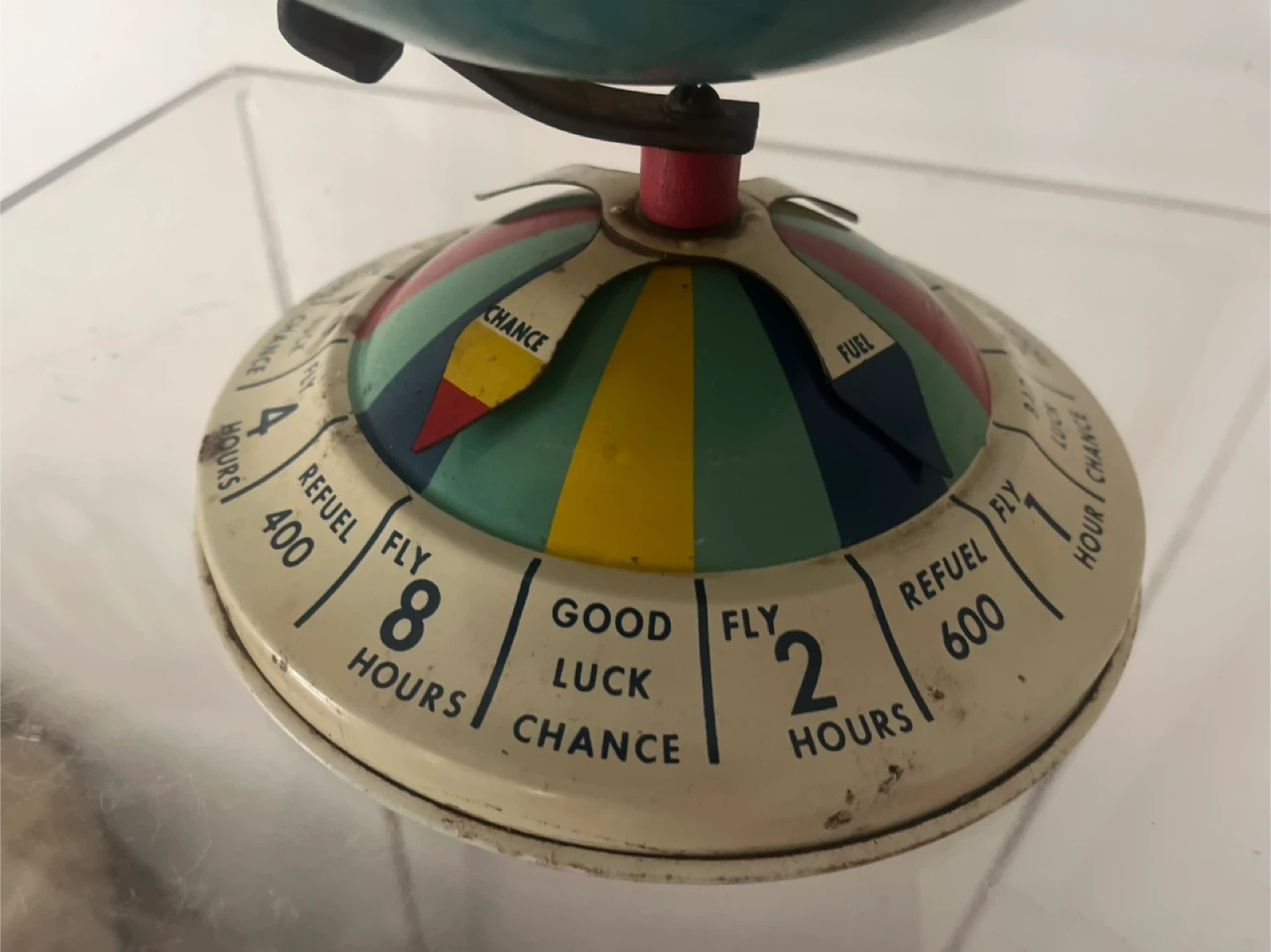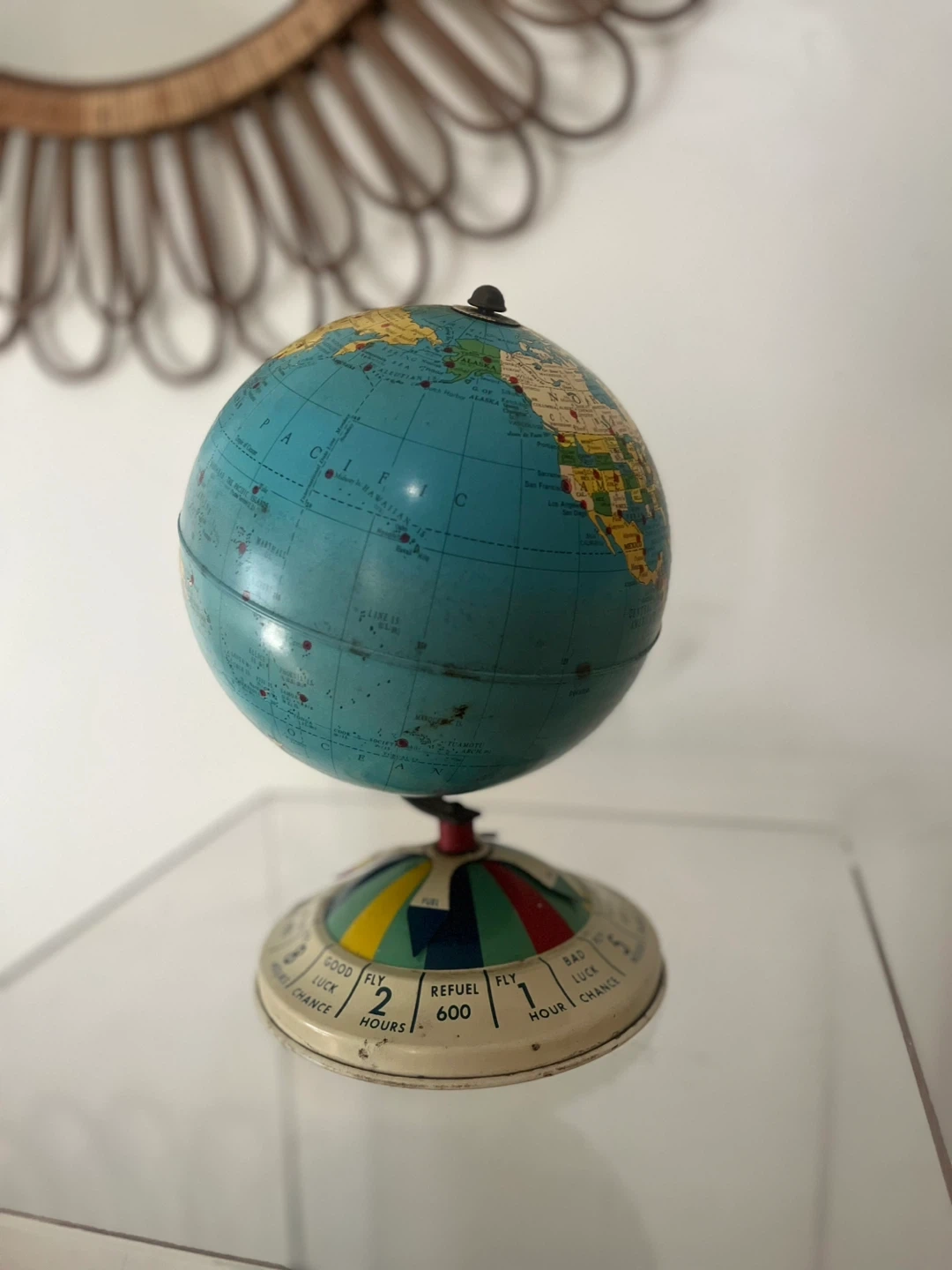 Selling a vintage metal globe! It features a colourful base with a luck indicator, showing "Good Luck Chance" and "Bad Luck Chance" depending on the hours. The globe itself shows countries and continents. A unique piece for any collector!