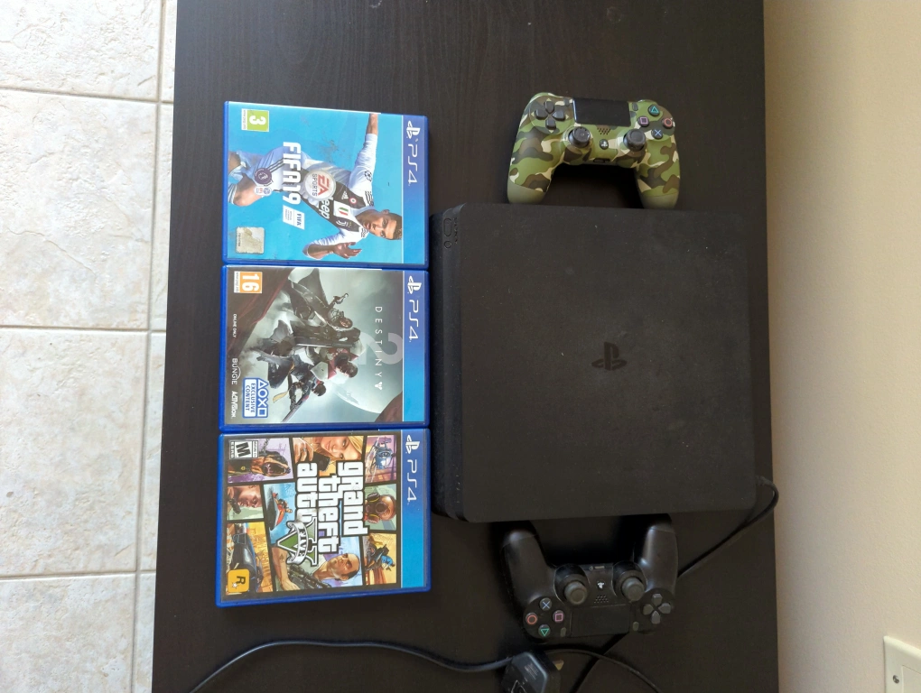 Selling a PlayStation 4 with a few games: FIFA 19, Destiny 2, and Grand Theft Auto V. Includes two controllers, one black and one camo. Ready for some gaming fun