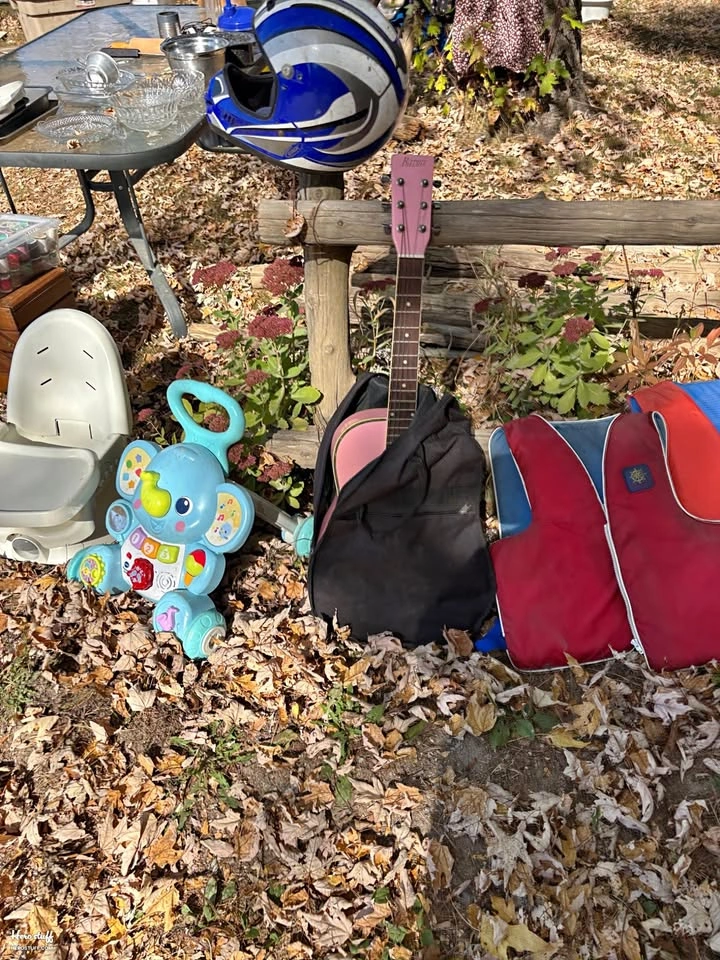 Pink acoustic guitar with a black gig bag, has some wear but still plays fine. Good for anyone starting out or just wanting something to strum on.