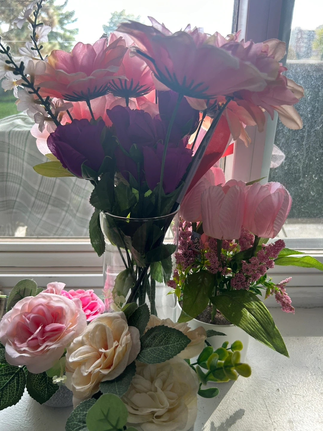 53A lovely artificial flower arrangement to brighten up any space! These faux flowers are perfect for adding a touch of colour and charm without the hassle of watering or maintenance. They're in great condition and ready to find a new home Moving sale Give away in. 5$ all decor