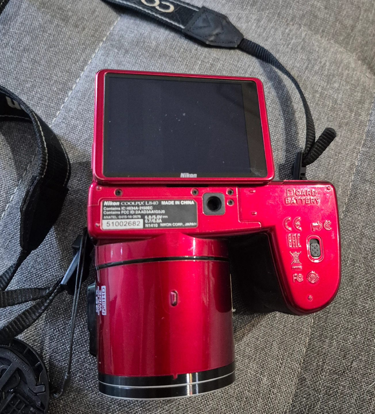 Selling a Nikon COOLPIX L840 digital camera in red. It features a NIKKOR 38x wide optical zoom ED VR lens with 4.0-152mm 1:3-6.5 capabilities.