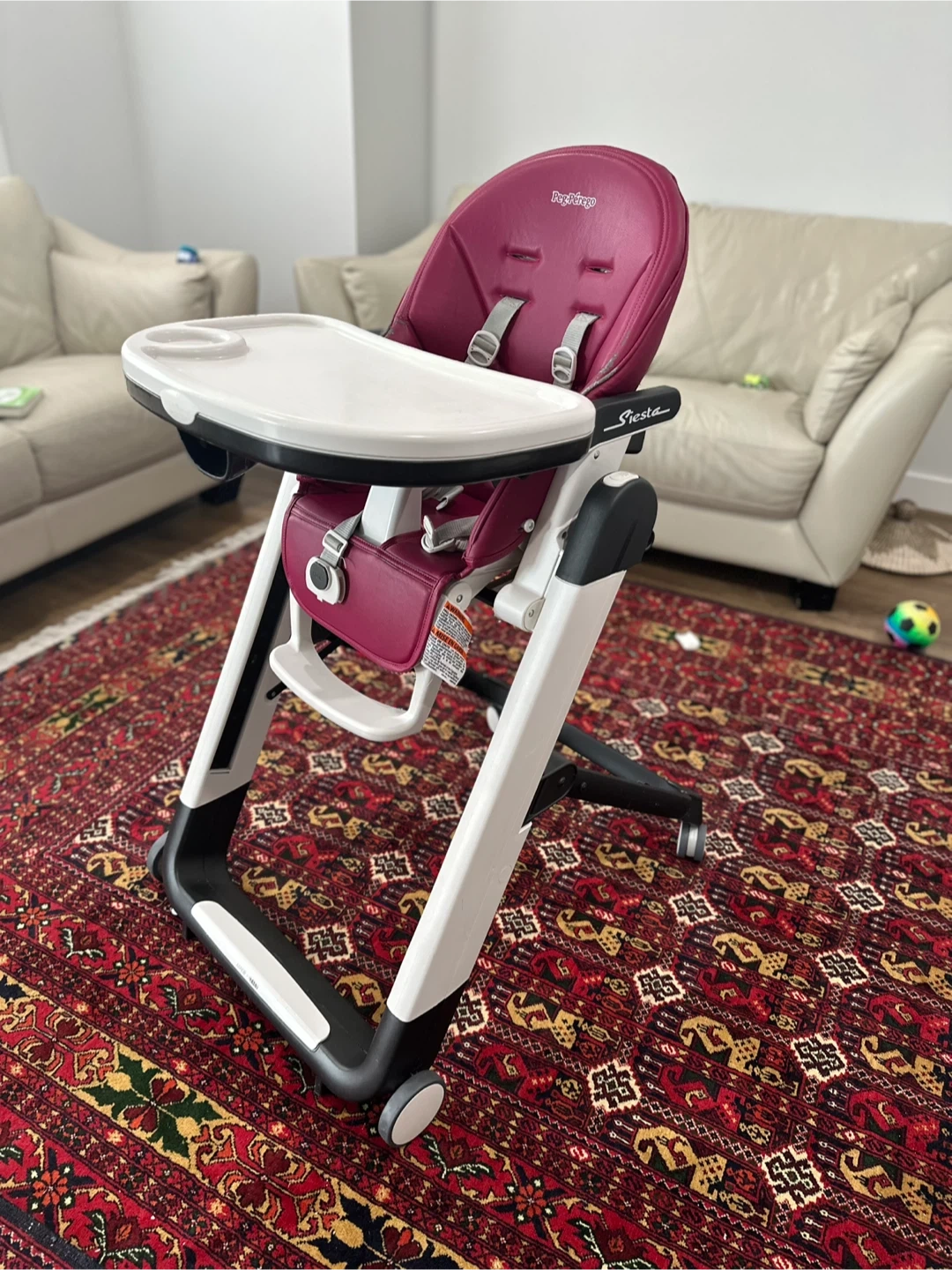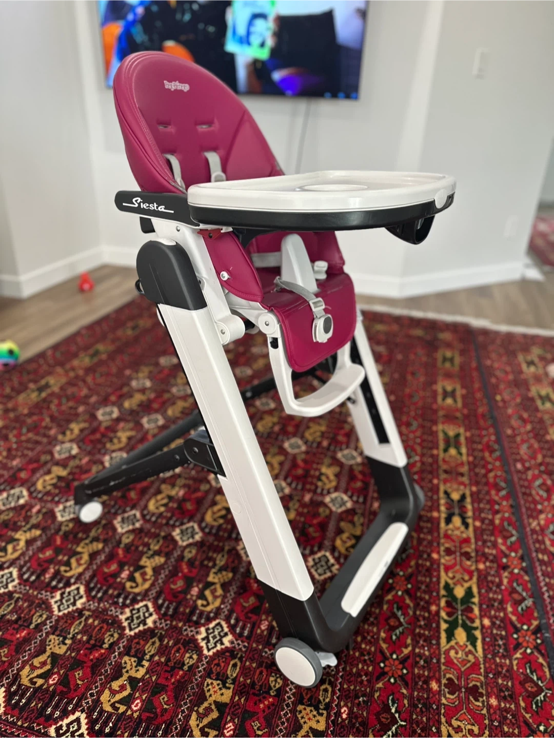 Selling a Peg Perego Siesta high chair in berry colour! It's in great condition and ready for a new home. This high chair is super convenient with its adjustable height and reclining seat. Perfect for feeding time and beyond!
