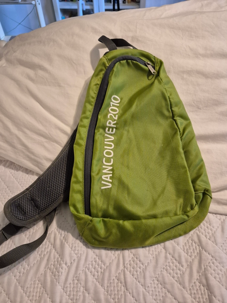 Selling a green sling bag from the Vancouver 2010 Olympics! It's in great shape and perfect for carrying essentials on the go. Features a comfortable strap and a compact design. Used once.