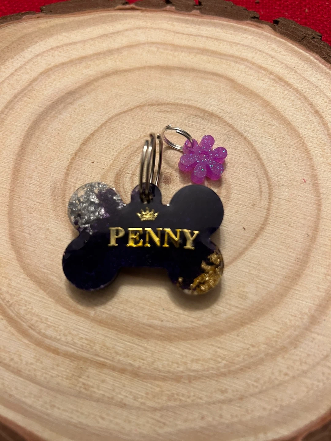 A cute, custom-made pet ID tag for your furry friend! This bone-shaped tag is a stylish way to keep your pet safe. It features the name 'Penny' in gold lettering and has a lovely purple flower charm attached