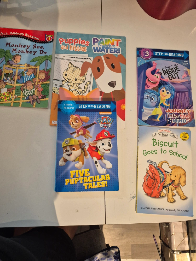 Selling a bundle of kids' books, perfect for early readers! Includes: - All Aboard Reading: Monkey See, Monkey Do - Puppies and Kitties Paint with Water! - Step into Reading: Inside Out Journey into the Mind - My First I Can Read Book: Biscuit Goes to School - Step into Reading: Paw Patrol Five Puptacular Tales on multiple sites Rutland location fcfs can possibly deliver
