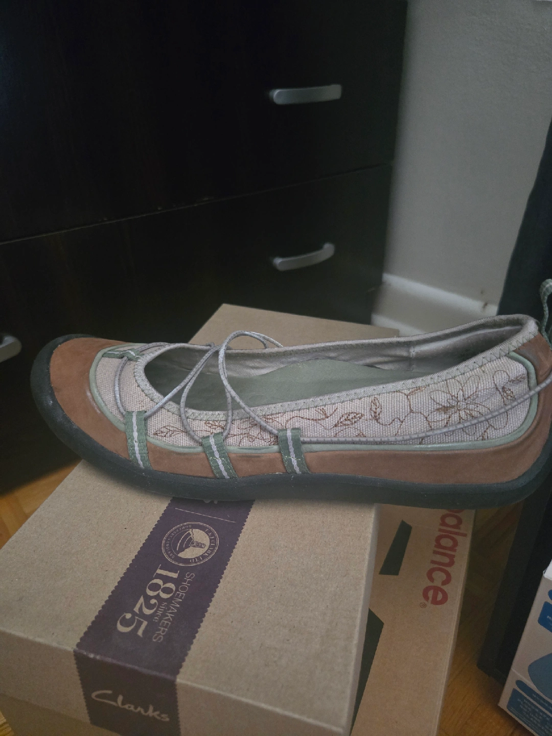 Earth Origins casual shoes with a unique design. These shoes are perfect for everyday wear and offer great comfort. They have a stylish look with a blend of beige, brown, and green tones. The design incorporates floral patterns on the fabric upper, and the elastic laces provide a snug fit. A great addition to your casual wardrobe!