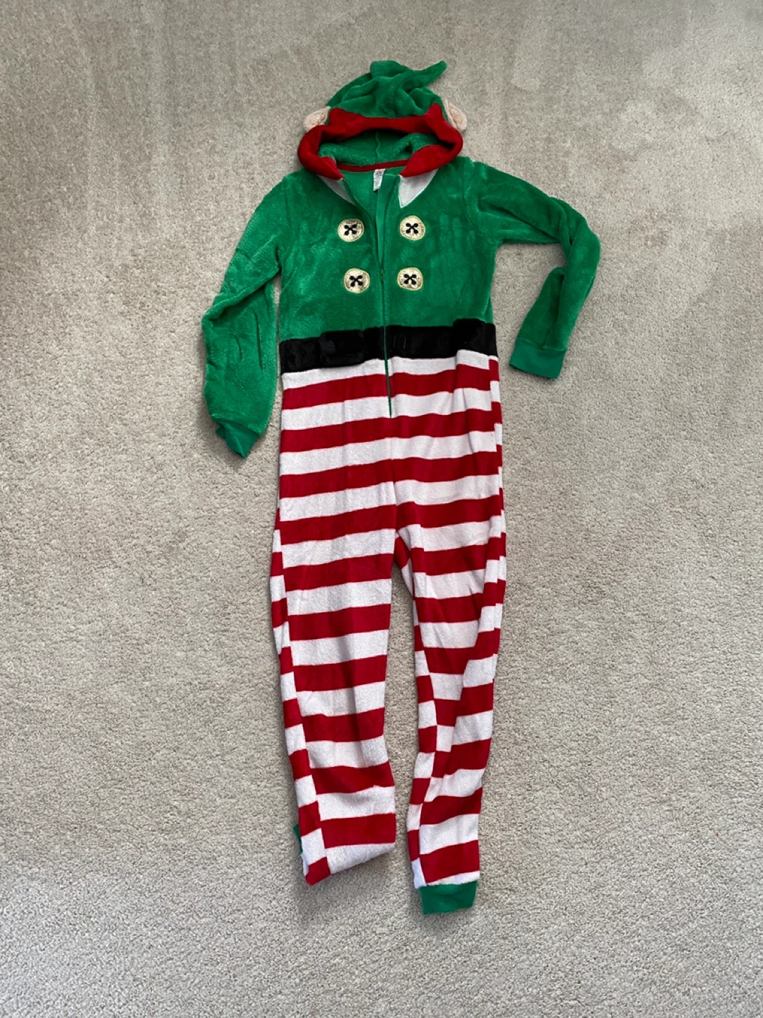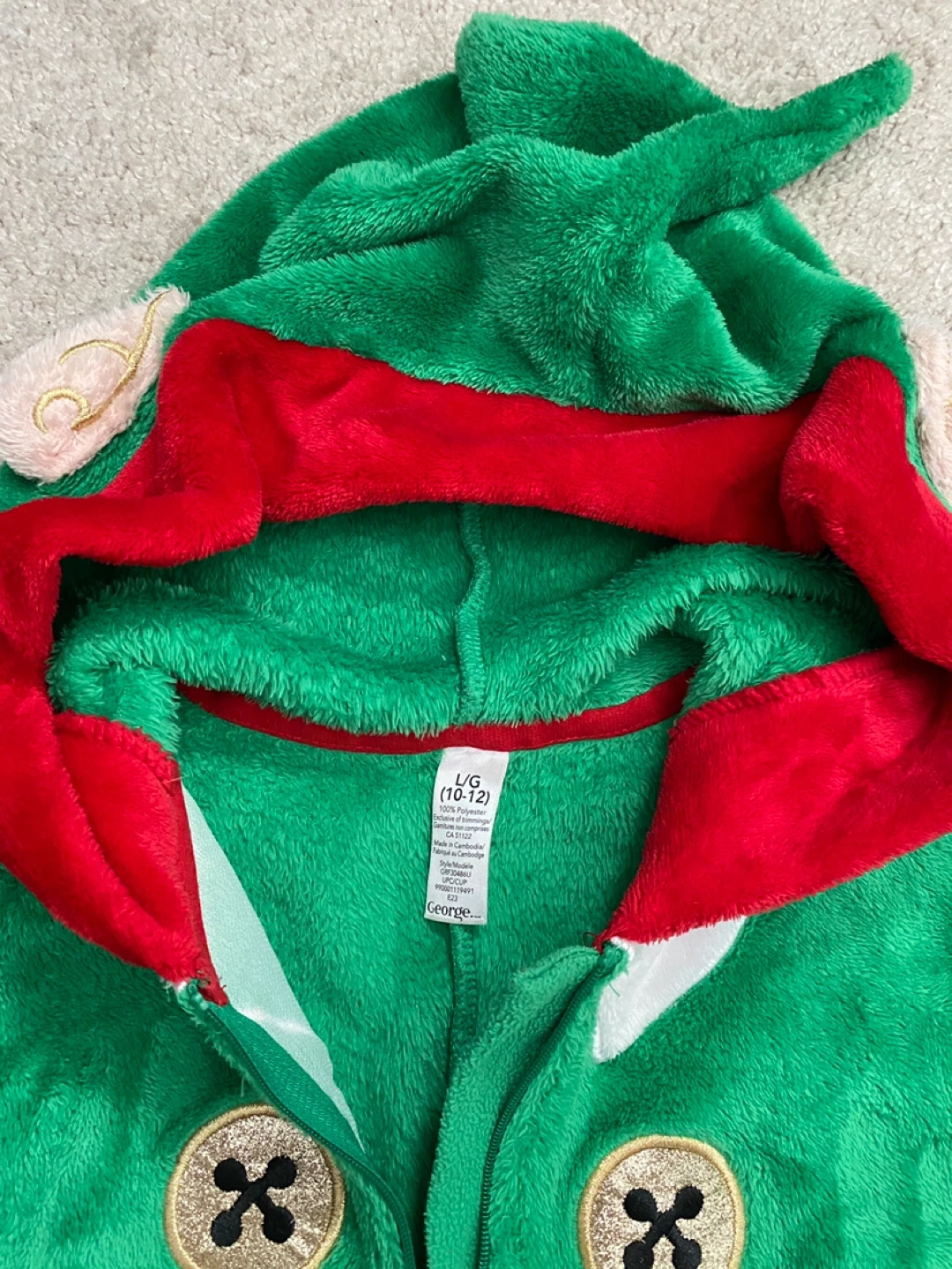 Keep your little one cozy with this adorable George elf onesie! It's a size L/G (10-12) and features a festive design with a hooded elf hat, red trim, and striped legs. Perfect for holiday fun or just lounging around the house