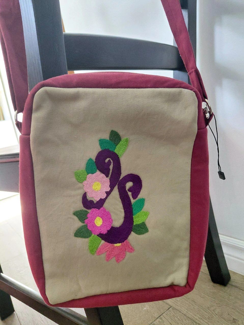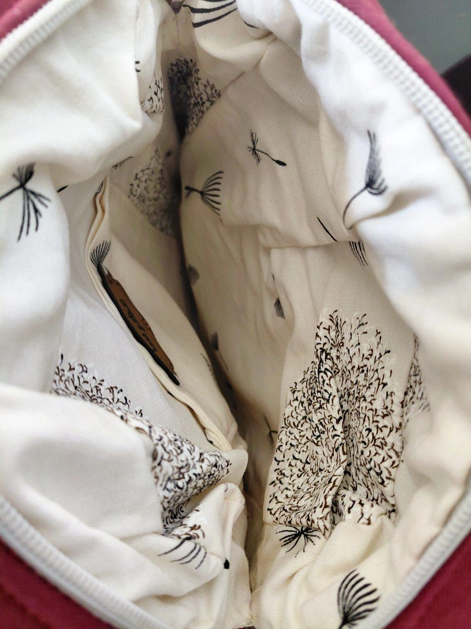 A cute burgundy crossbody bag that's perfect for everyday use! It features a unique floral design on the front and a comfortable strap. The inside has a unique dandelion pattern.