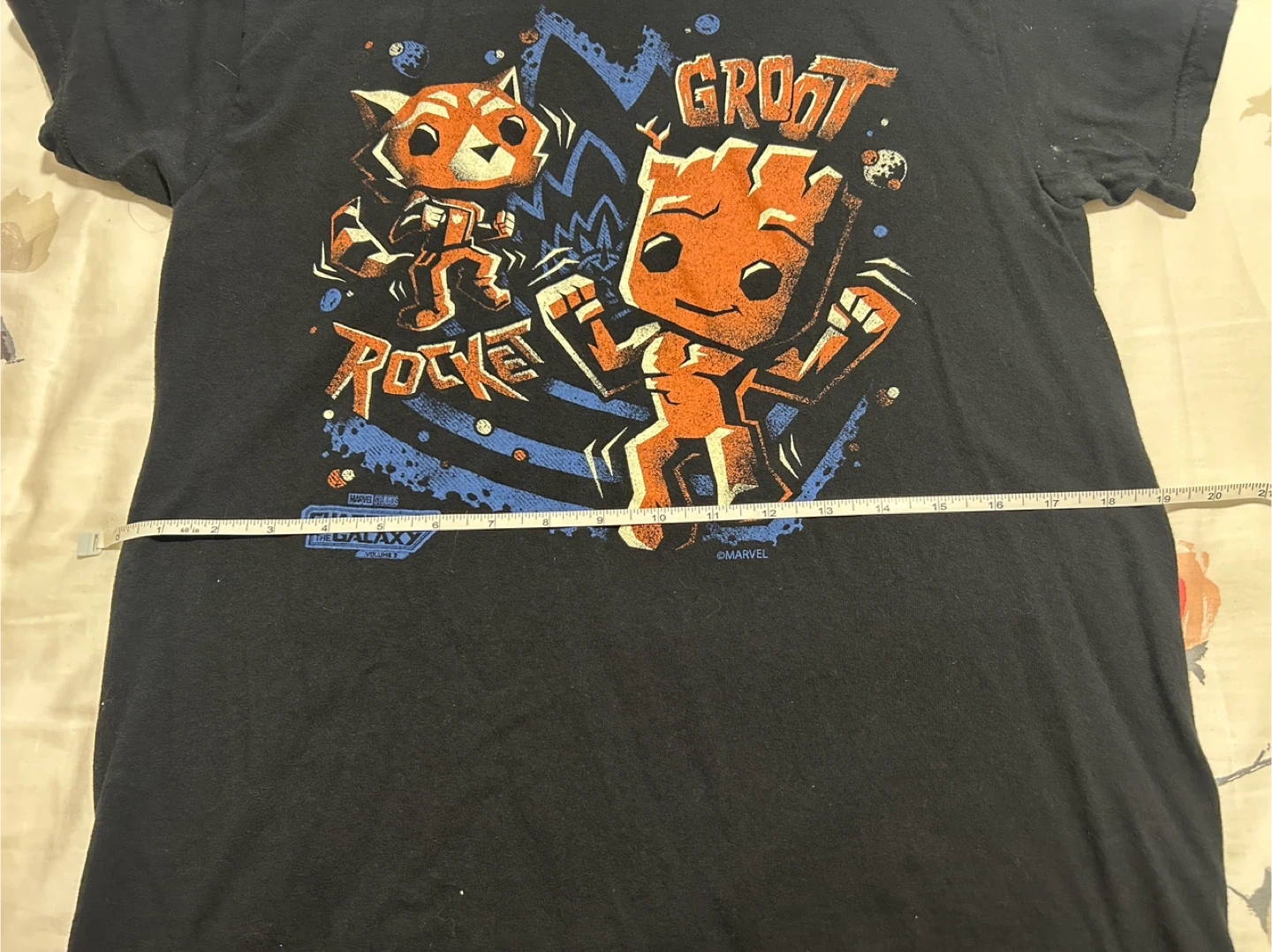 Funko Guardians of the Galaxy T-shirt featuring Groot and Rocket! The tag indicates it's a size L. It's made of 100% cotton, so it's nice and breathable. Center measures 19” across Length is approx 27” Worn only a few times Smoke Free/Pet Free home Check my other listings for more clothing items!