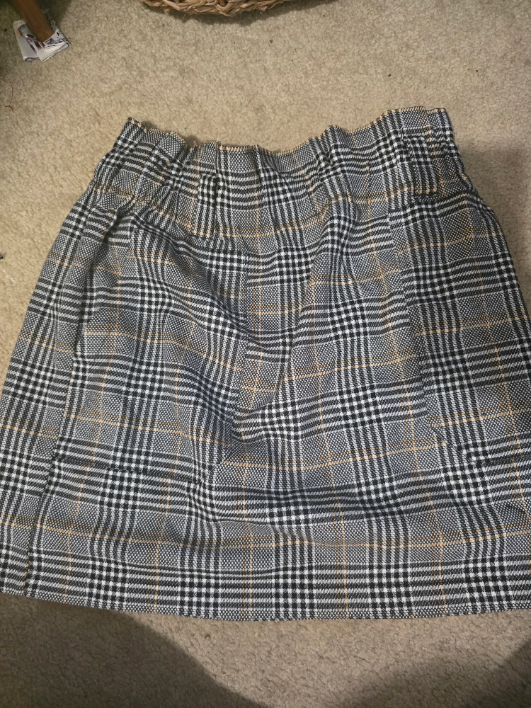 Selling a cute plaid skirt! It's in great condition and perfect for adding a touch of style to any outfit. The skirt features a classic plaid pattern with black, white, and tan colours. It has an elastic waistband for a comfortable fit