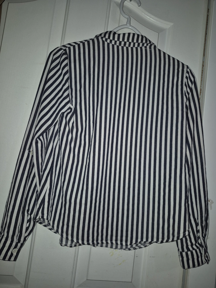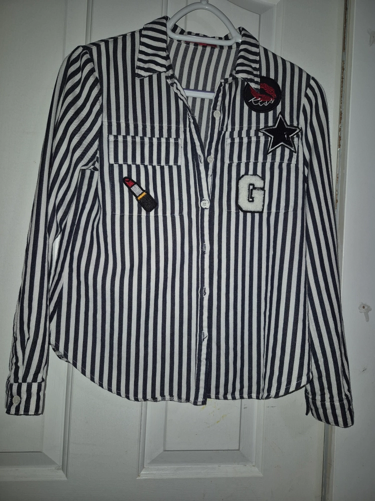 Here's a cute Guess blouse in size XS! It features a stylish striped pattern and some fun patches on the front. Perfect for adding a bit of flair to your wardrobe