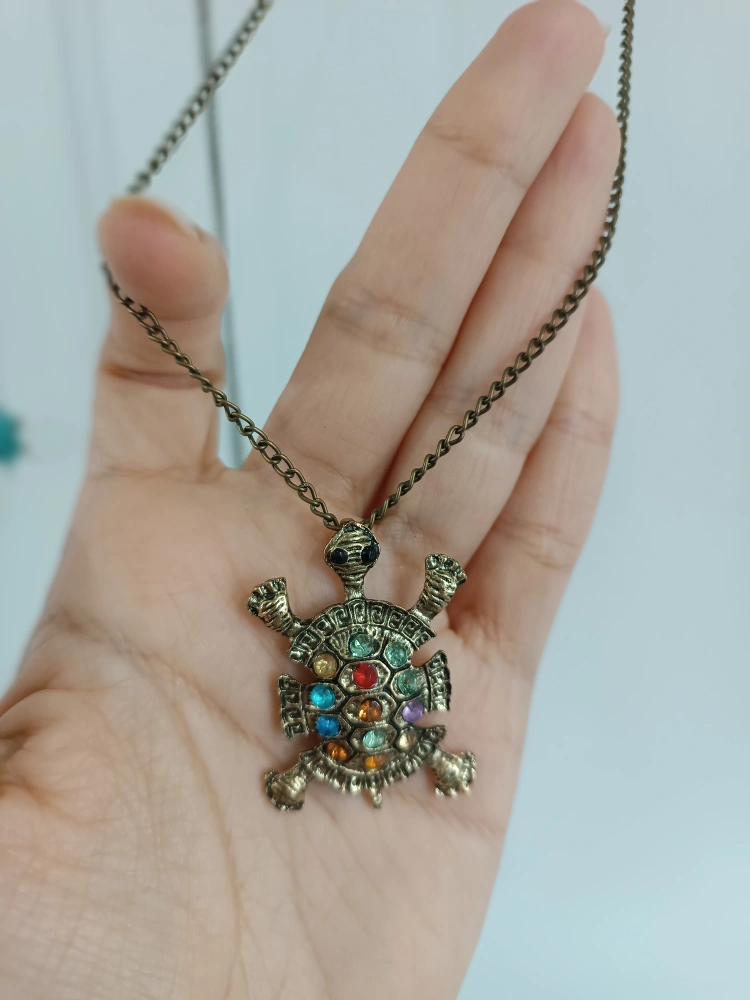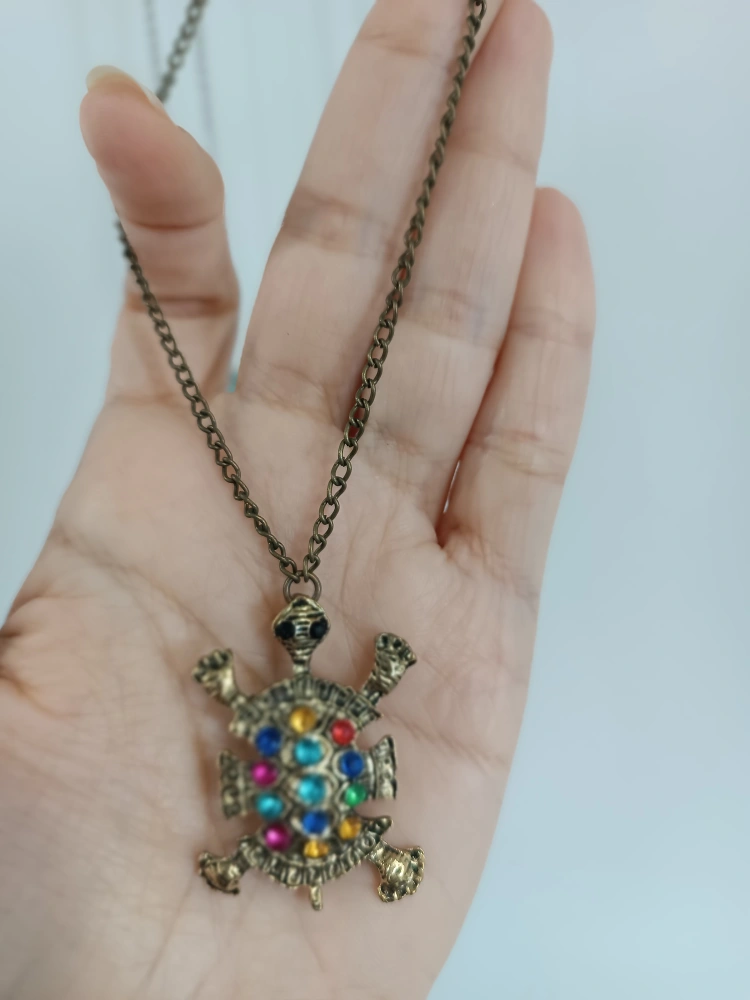 Cute turtle pendant necklace with colourful stones. Two of The pendants are in a bronze colour and the chain is a matching bronze colour as well. Perfect for adding a unique touch to any outfit! ๐ข ๐