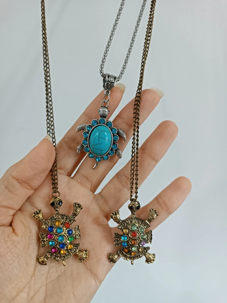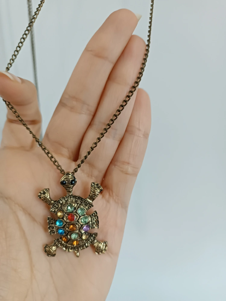 Cute turtle pendant necklace with colourful stones. Two of The pendants are in a bronze colour and the chain is a matching bronze colour as well. Perfect for adding a unique touch to any outfit! ๐ข ๐
