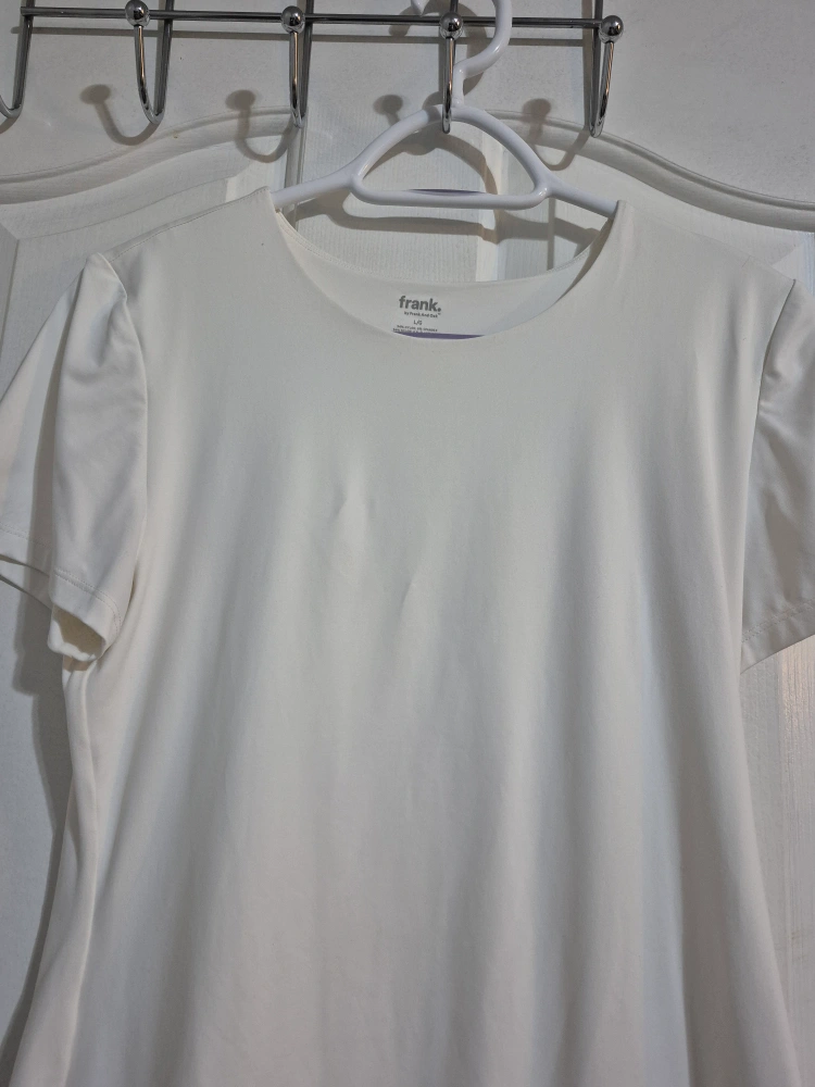 Selling a Frank and Oak T-shirt in size L. It's a lovely white colour and made from 94% nylon and 6% spandex, so it's nice and stretchy! The fabric is super comfortable.