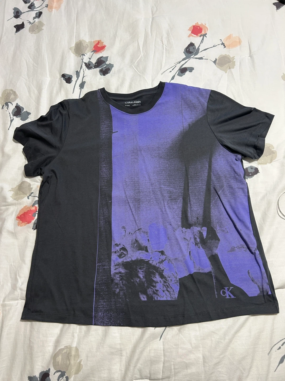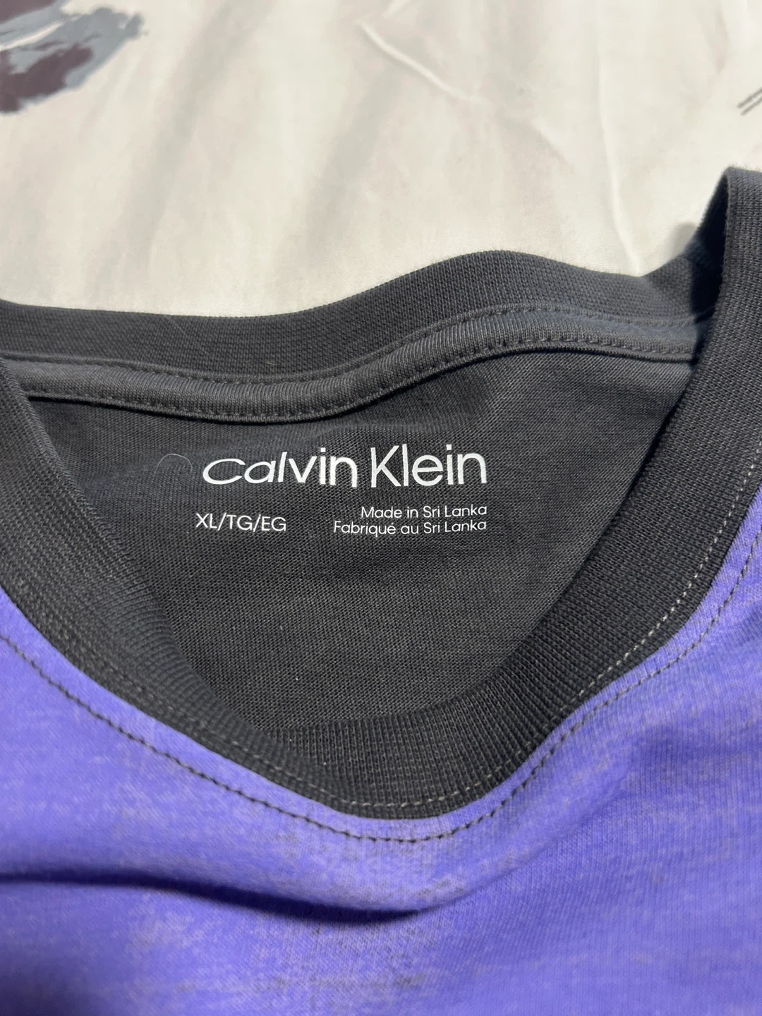 Here's a Calvin Klein T-shirt in size XL/TG! It features a cool black and purple design. Made in Sri Lanka Center is 22.5” across Length is 26” Never worn Smoke Free/Pet Free home Check my other listings for more clothing items!