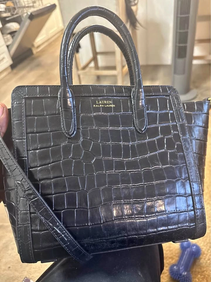 Sophisticated Lauren Ralph Lauren structured tote in black croc-embossed finish with gold logo detail. Can be carried by the top handles or worn hands-free with the detachable crossbody strap. • Color: Black • Faux croc-embossed leather • Top handles + removable crossbody strap • Structured silhouette, zip closure, roomy interior • Condition: Gently used, with minor wear (see photos)