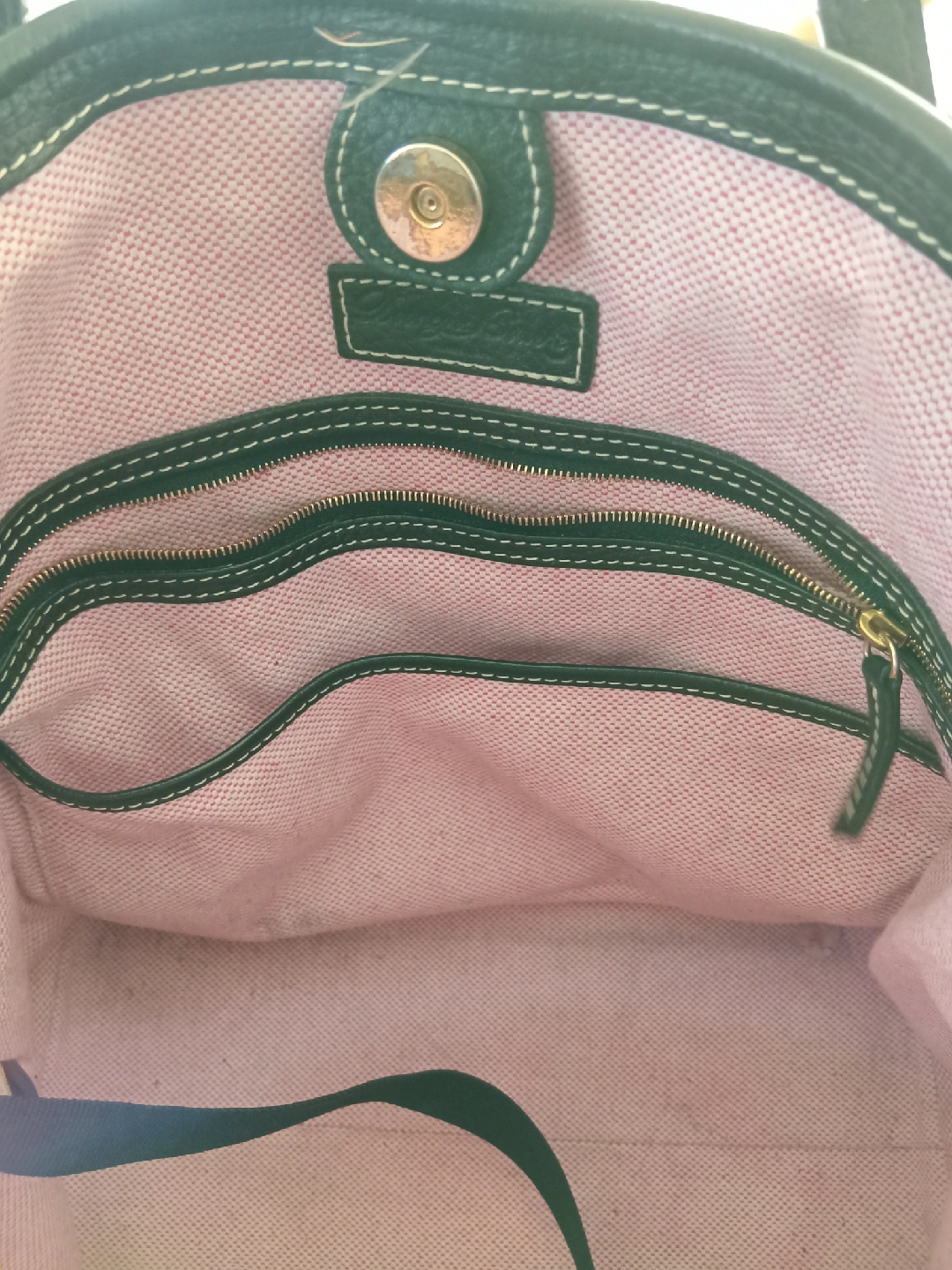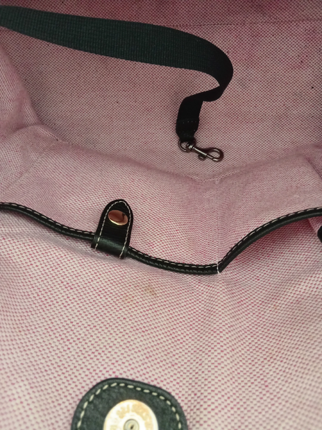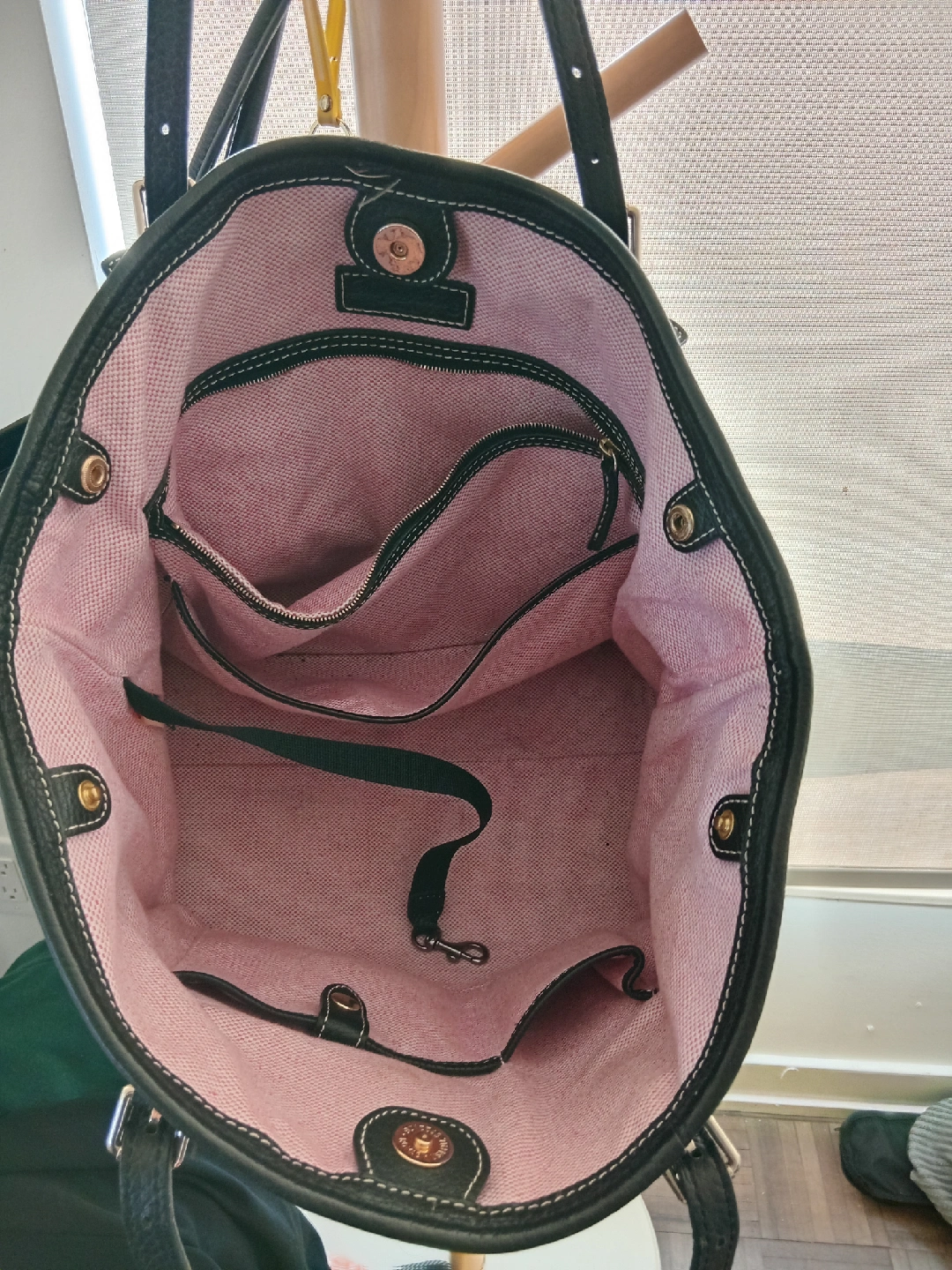 277Selling a Dooney & Bourke tote bag in black leather. It has a pink fabric interior with multiple pockets. There are some signs of use, but overall it's in good condition and ready for a new home!