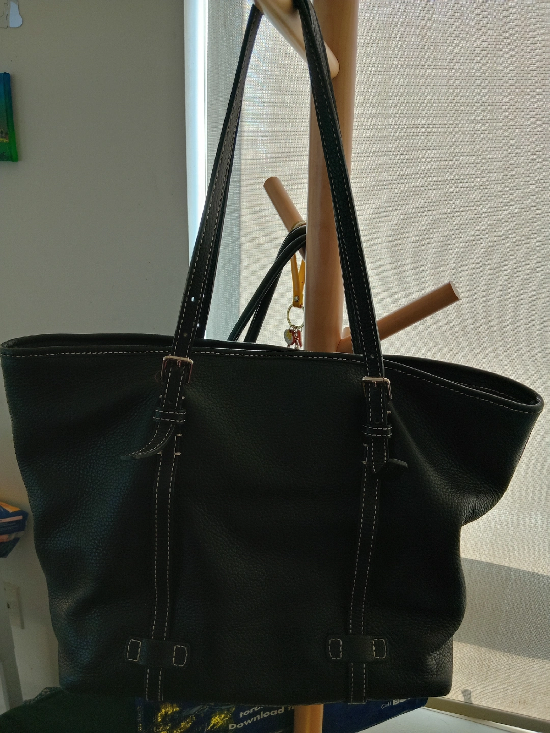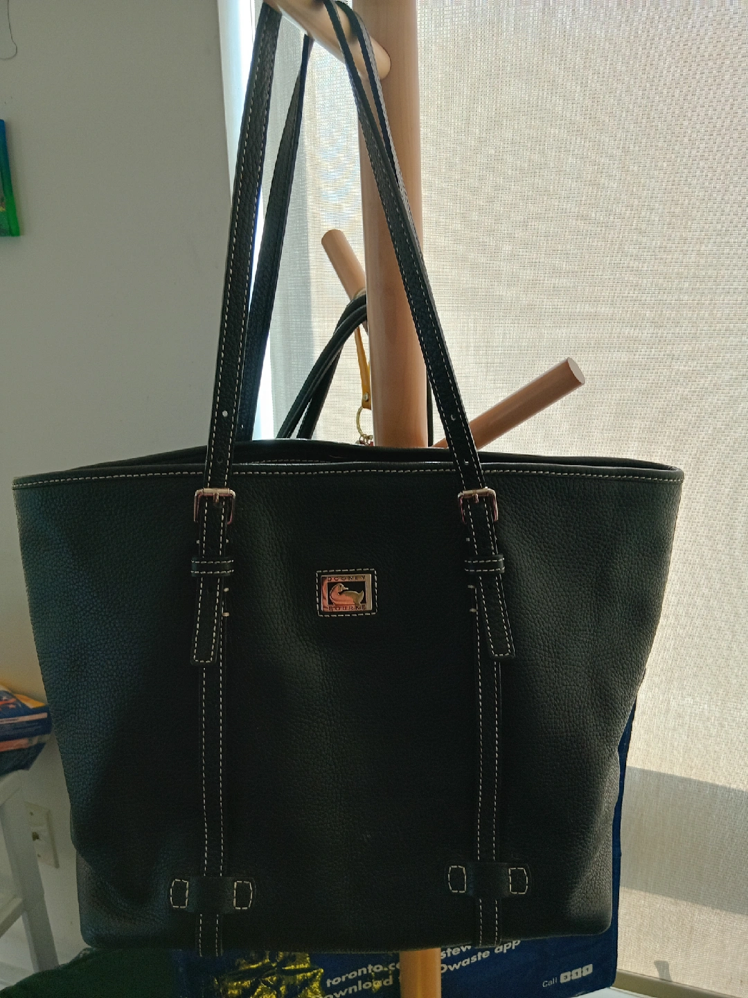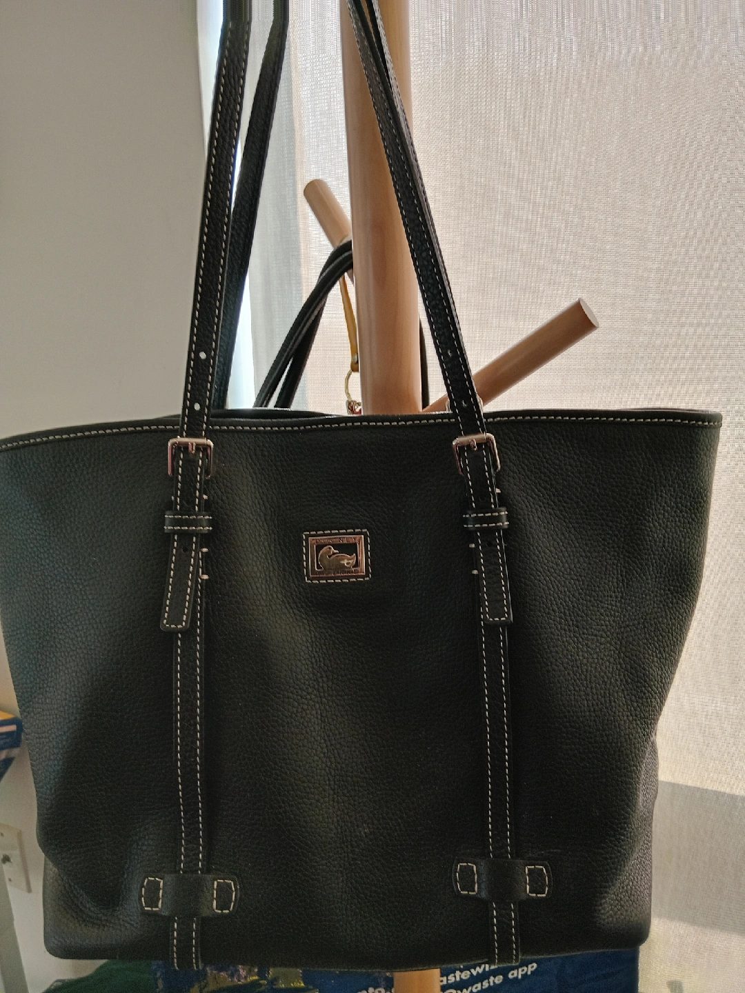 277Selling a Dooney & Bourke tote bag in black leather. It has a pink fabric interior with multiple pockets. There are some signs of use, but overall it's in good condition and ready for a new home!