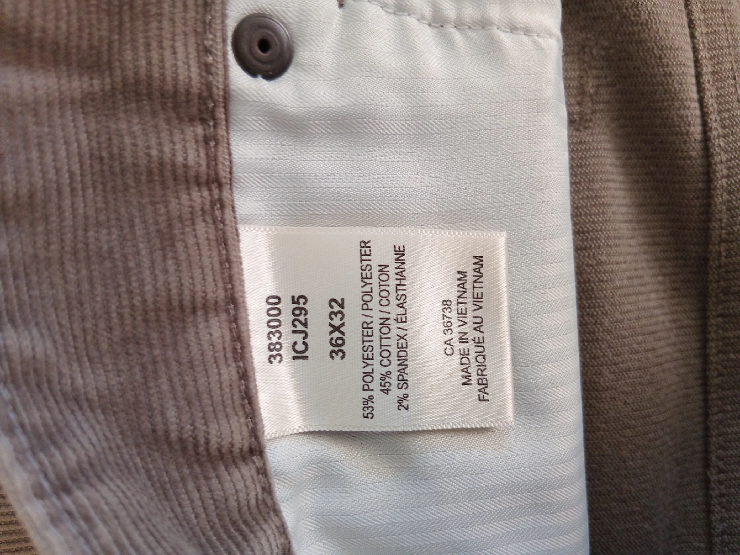 277Selling a pair of Haggar corduroy pants. They are size 36x32 and made of 53% polyester, 45% cotton, and 2% spandex/elastane. The pants are in great condition and ready for a new home!