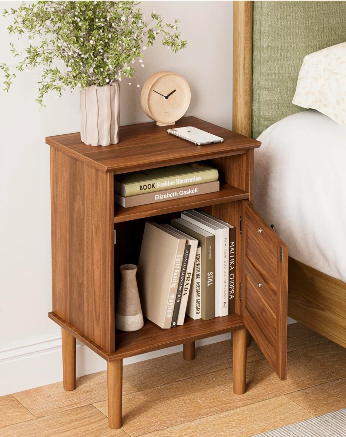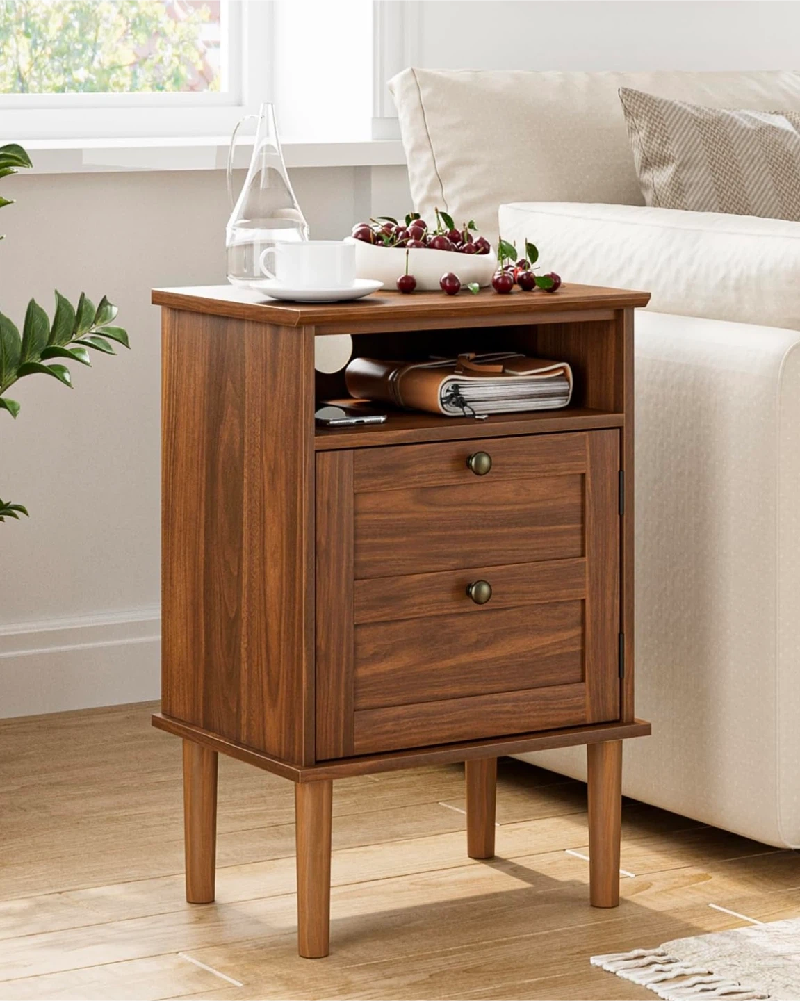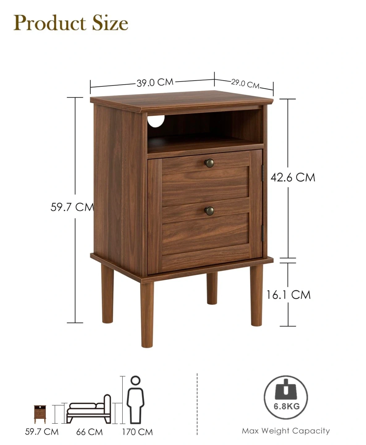 This is a stylish brown wood nightstand with ample storage space. It features a spacious tabletop, an open shelf, and a large space behind a door. The handles are round metal. Dimensions are approximately 59.7 cm tall, 39 cm wide, and 29 cm deep