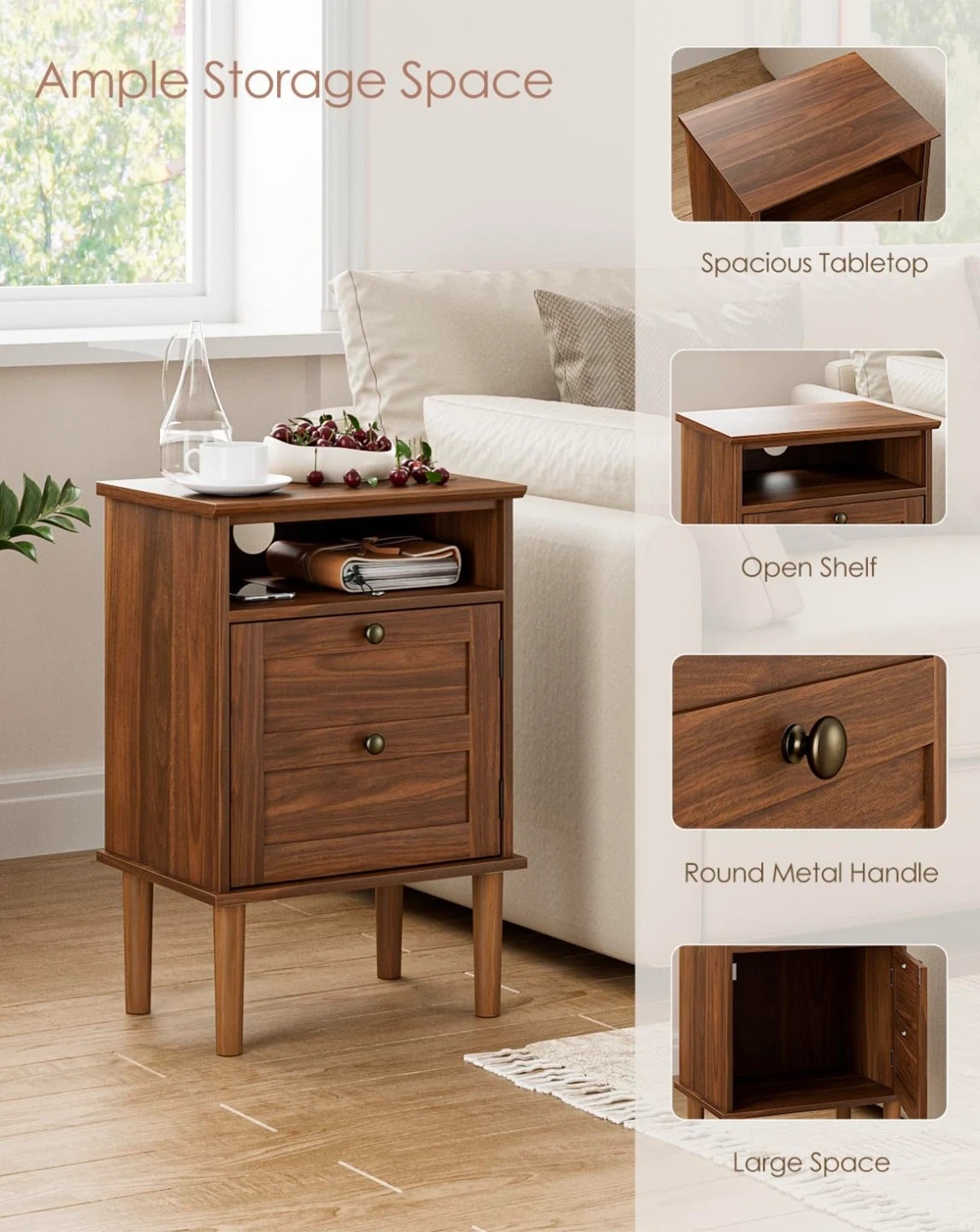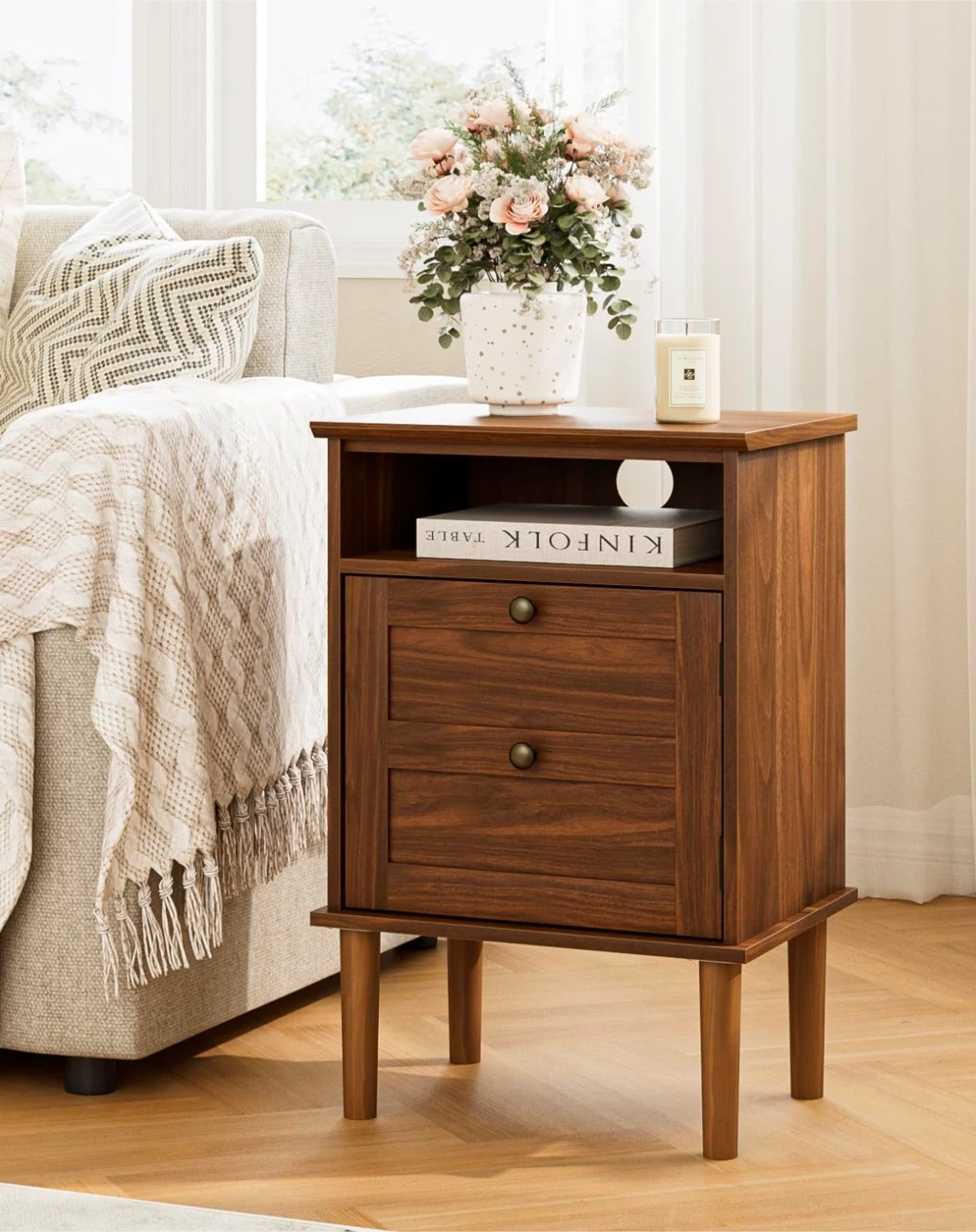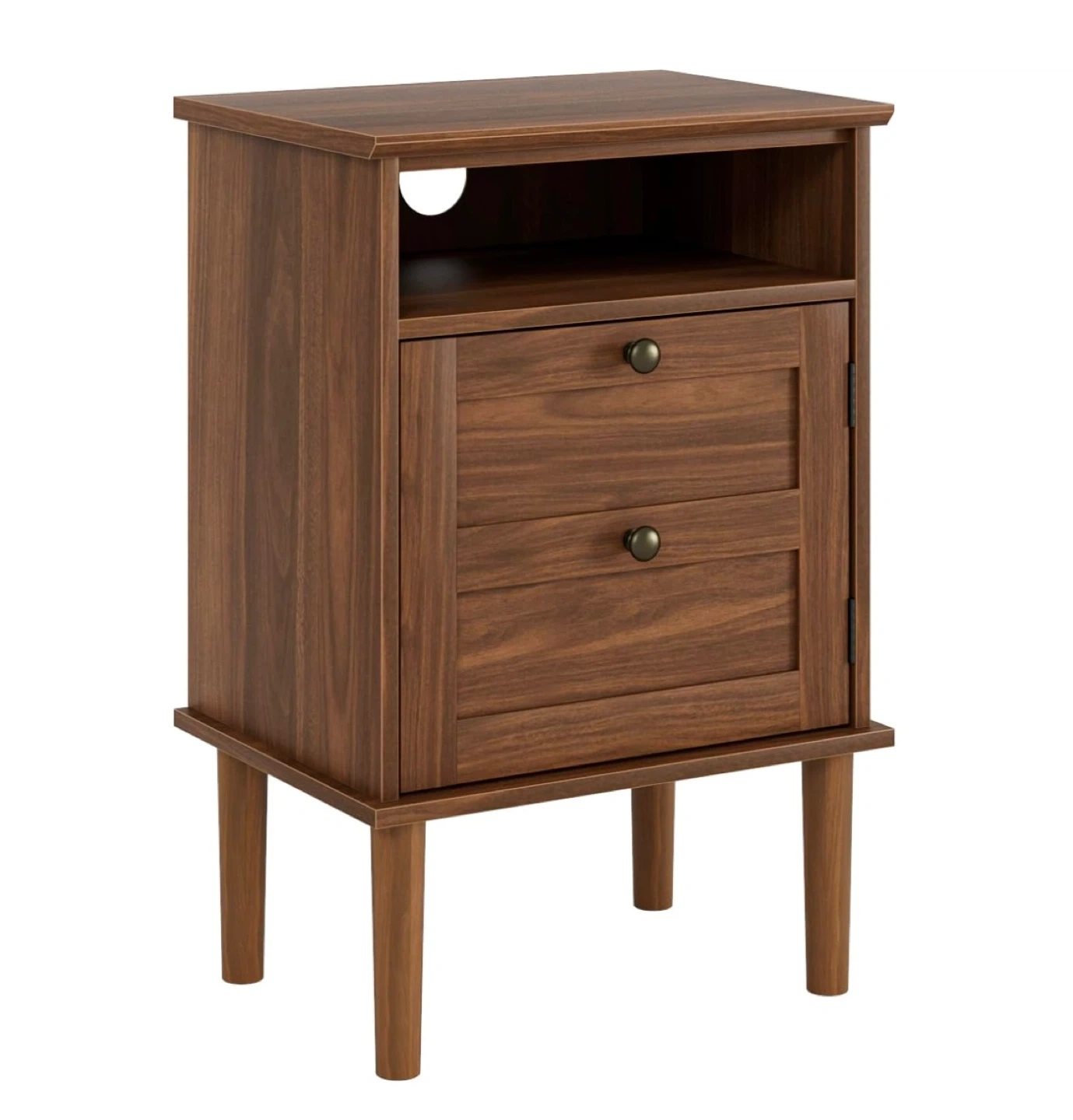 This is a stylish brown wood nightstand with ample storage space. It features a spacious tabletop, an open shelf, and a large space behind a door. The handles are round metal. Dimensions are approximately 59.7 cm tall, 39 cm wide, and 29 cm deep