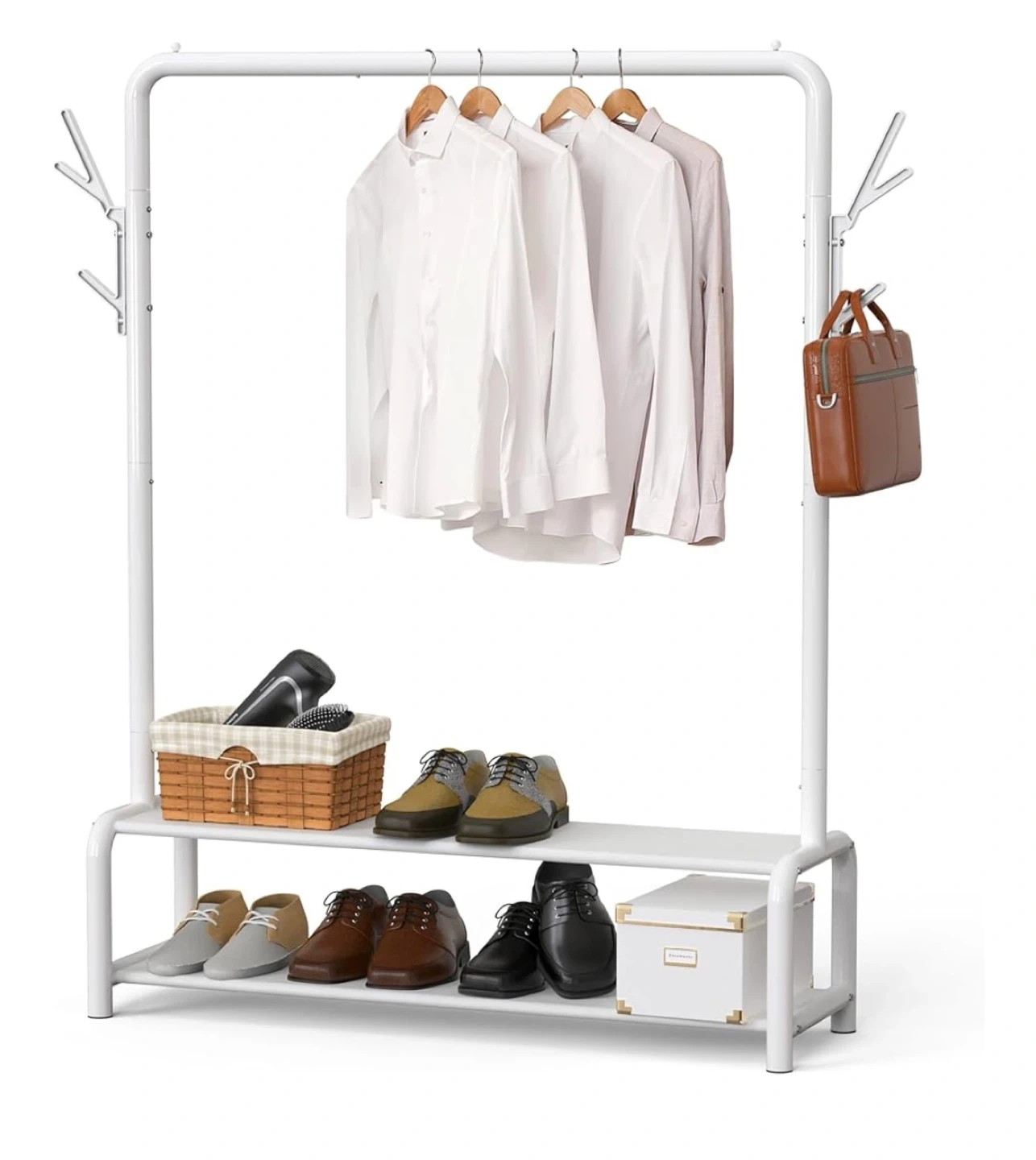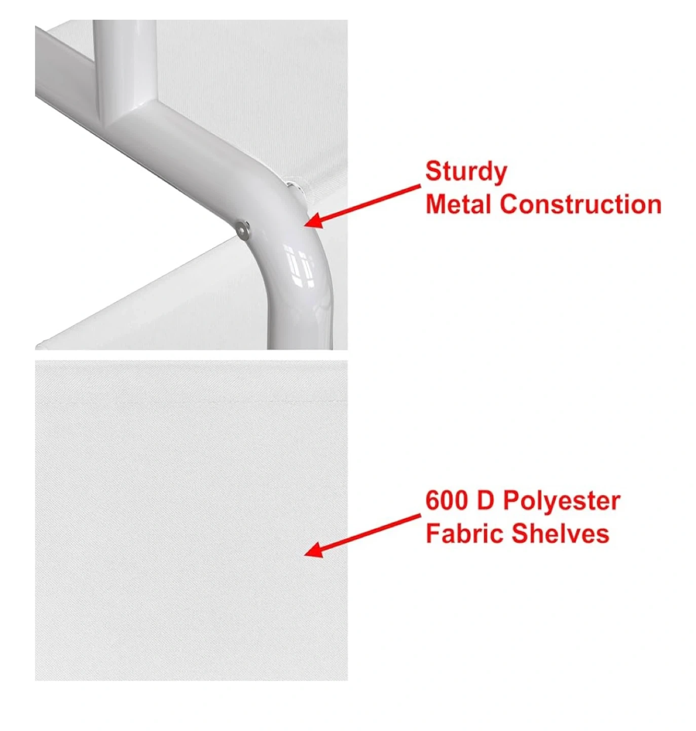 This Simple Houseware garment rack is perfect for adding extra storage to your space! It features a sturdy metal construction and 600 D polyester fabric shelves. The rack is white and measures approximately 51.75" wide and 60" tall. Great for organizing clothes, shoes, and accessories