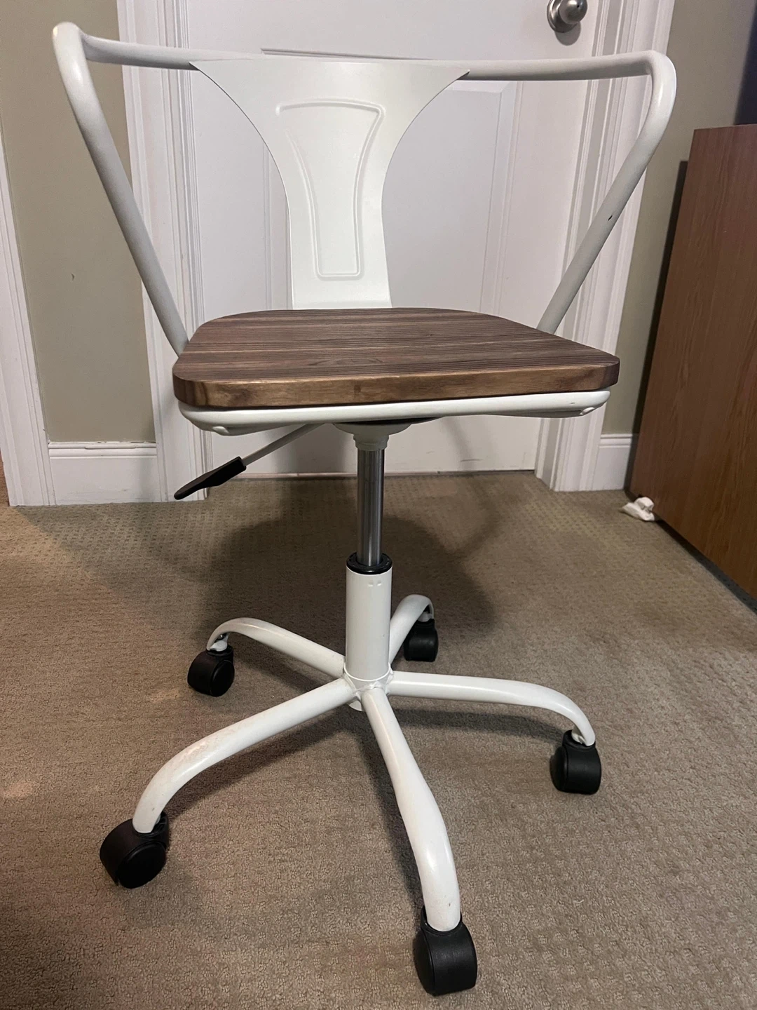 Selling a swivel chair with a white metal frame and a wooden seat. It's adjustable in height and has wheels for easy movement. There are some signs of wear on the base, but it's still in good working condition!