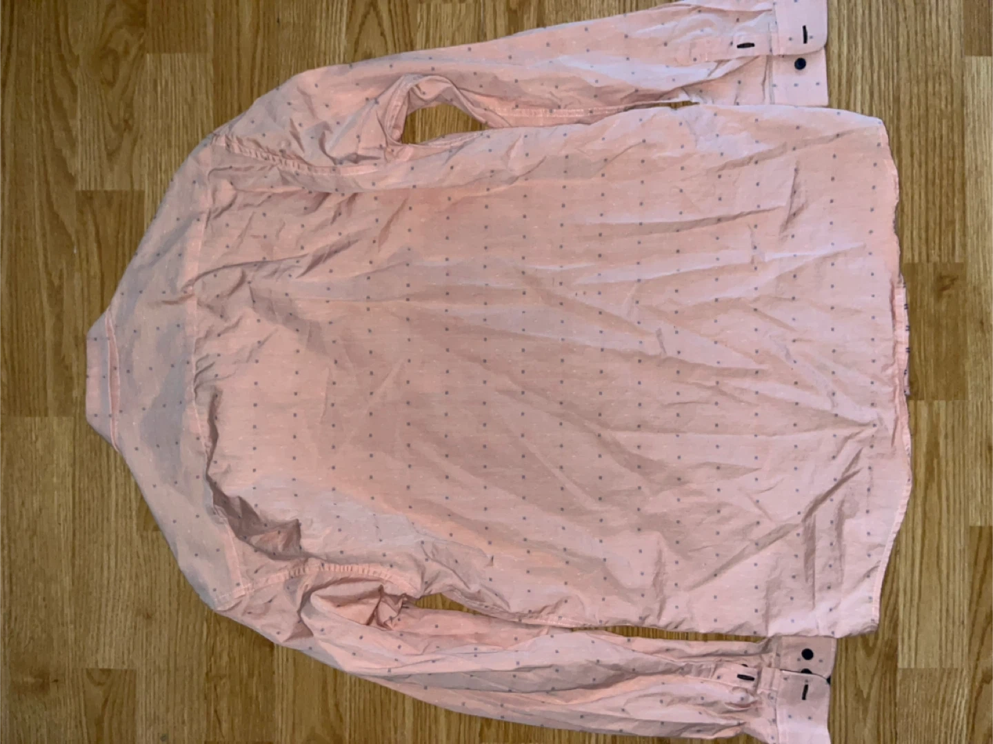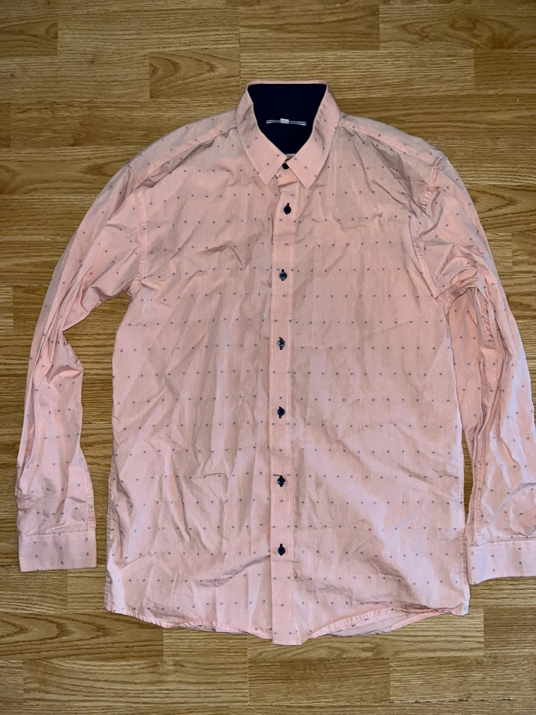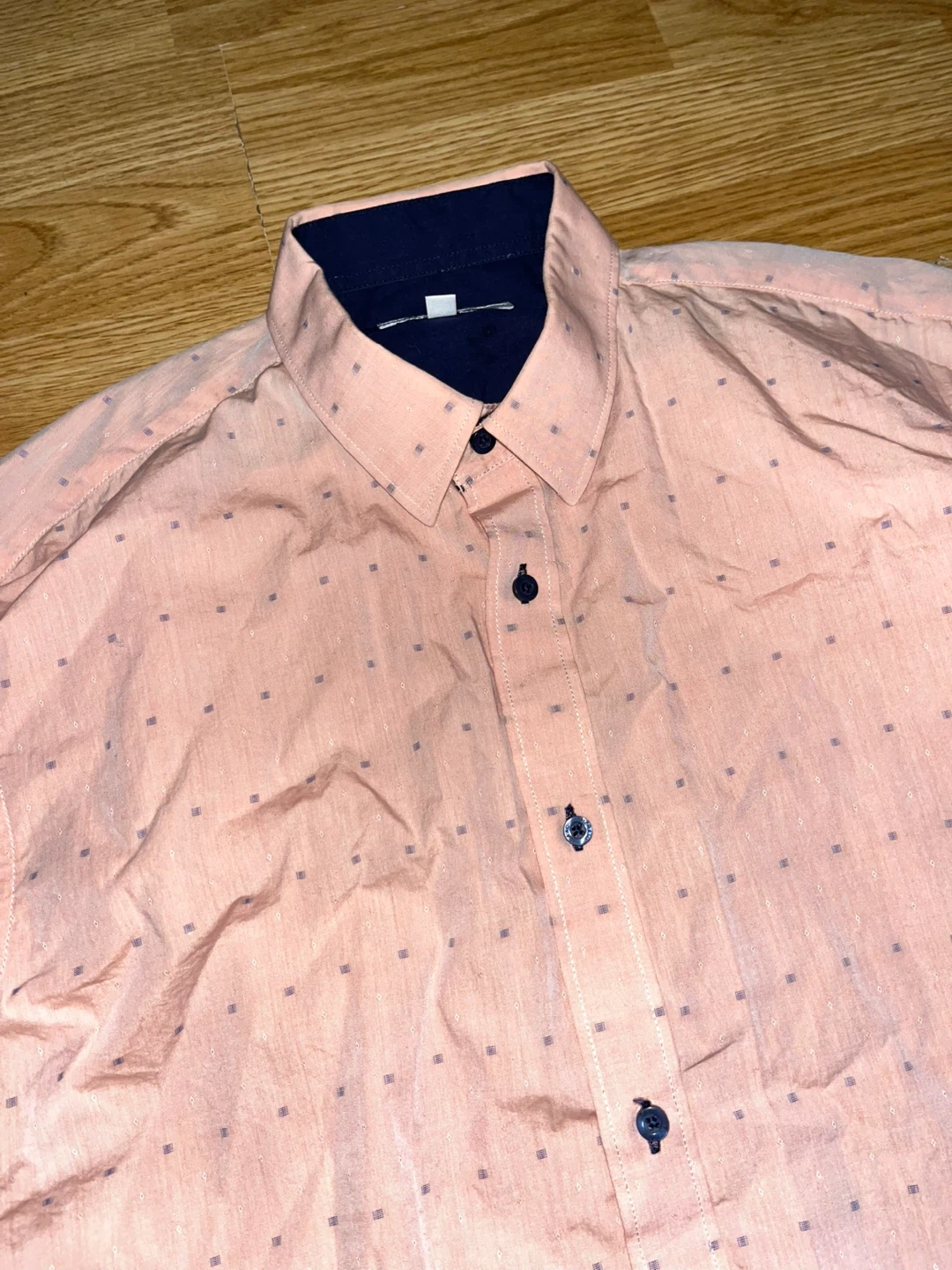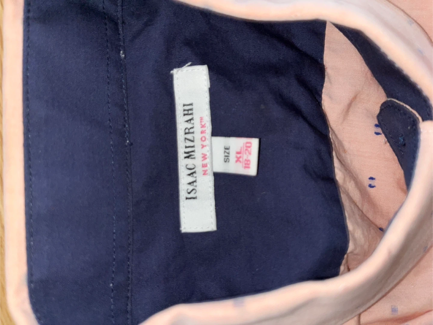142Here's a great dress shirt from Isaac Mizrahi New York! It's an XL size, fitting sizes 18-20. The colour is a nice peach tone with a navy blue inner collar. Perfect for a semi-formal occasion