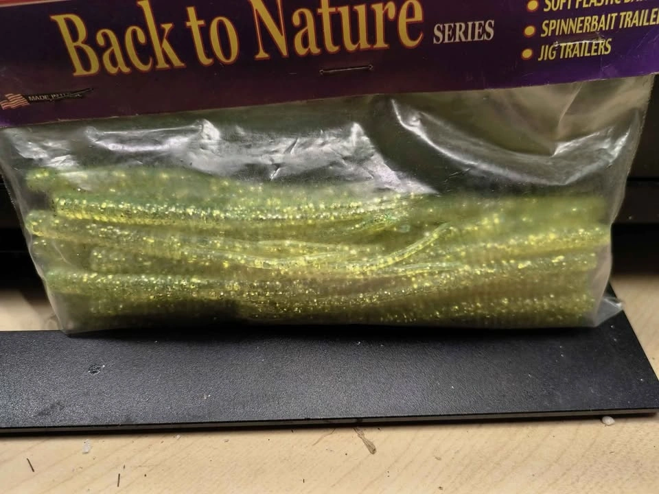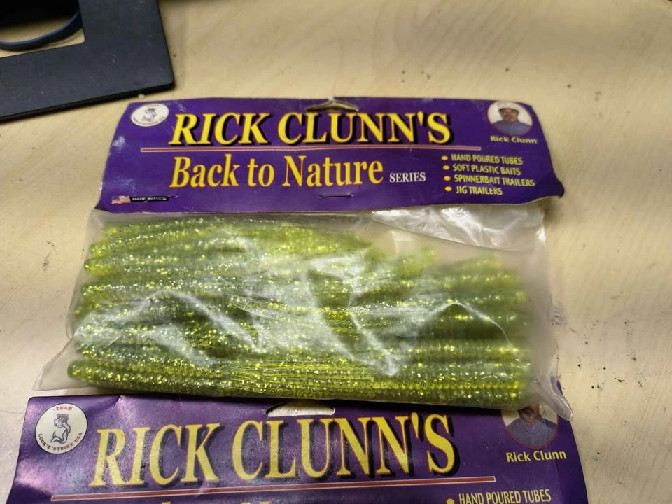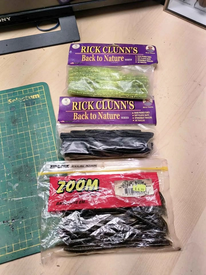 Some packs of soft plastics that don't get used enough. I've used maybe one out of each pack & there are still plenty left. The chartreuse & black packs are double tail & the Zoom is a standard nightcrawler.