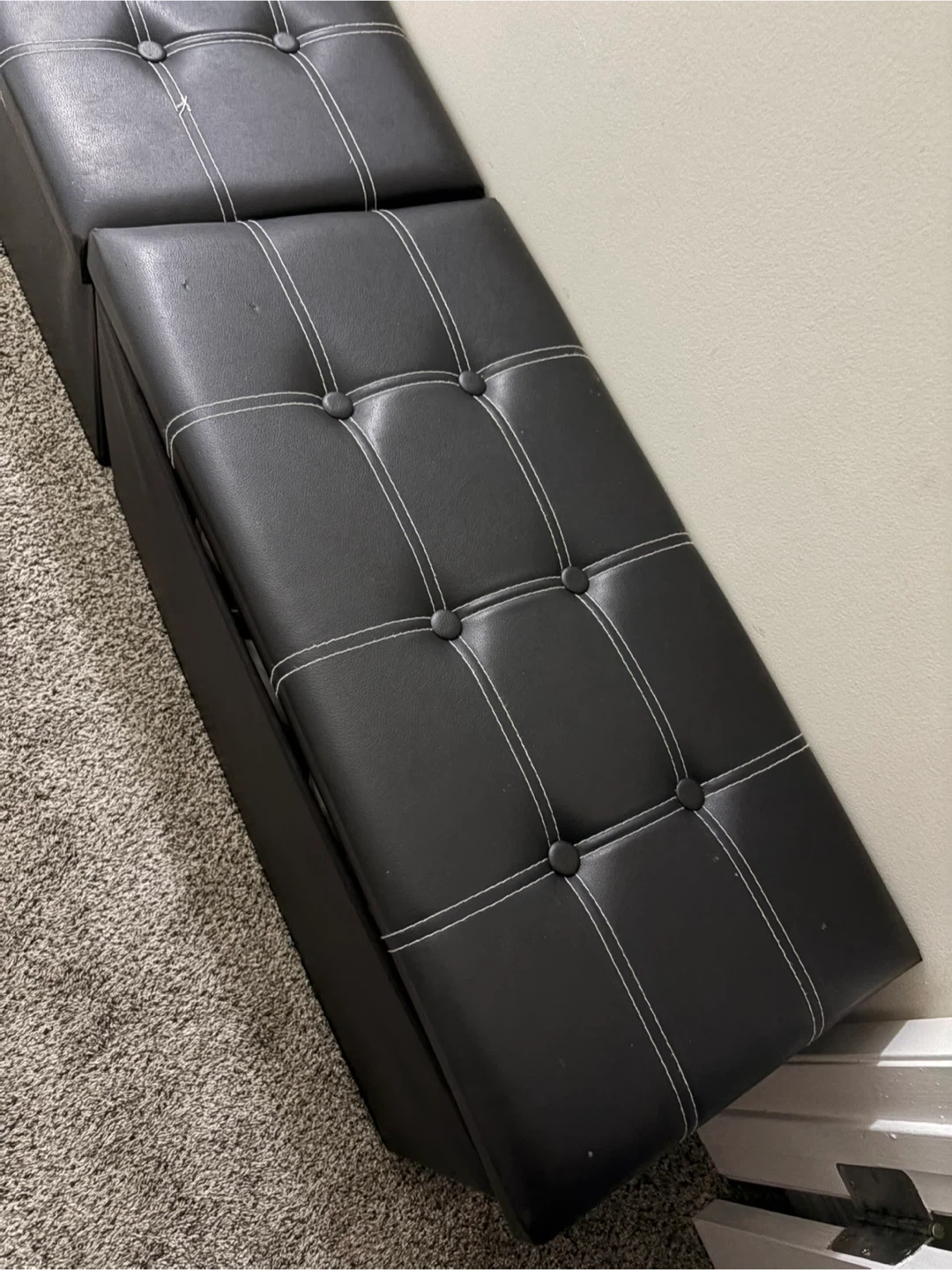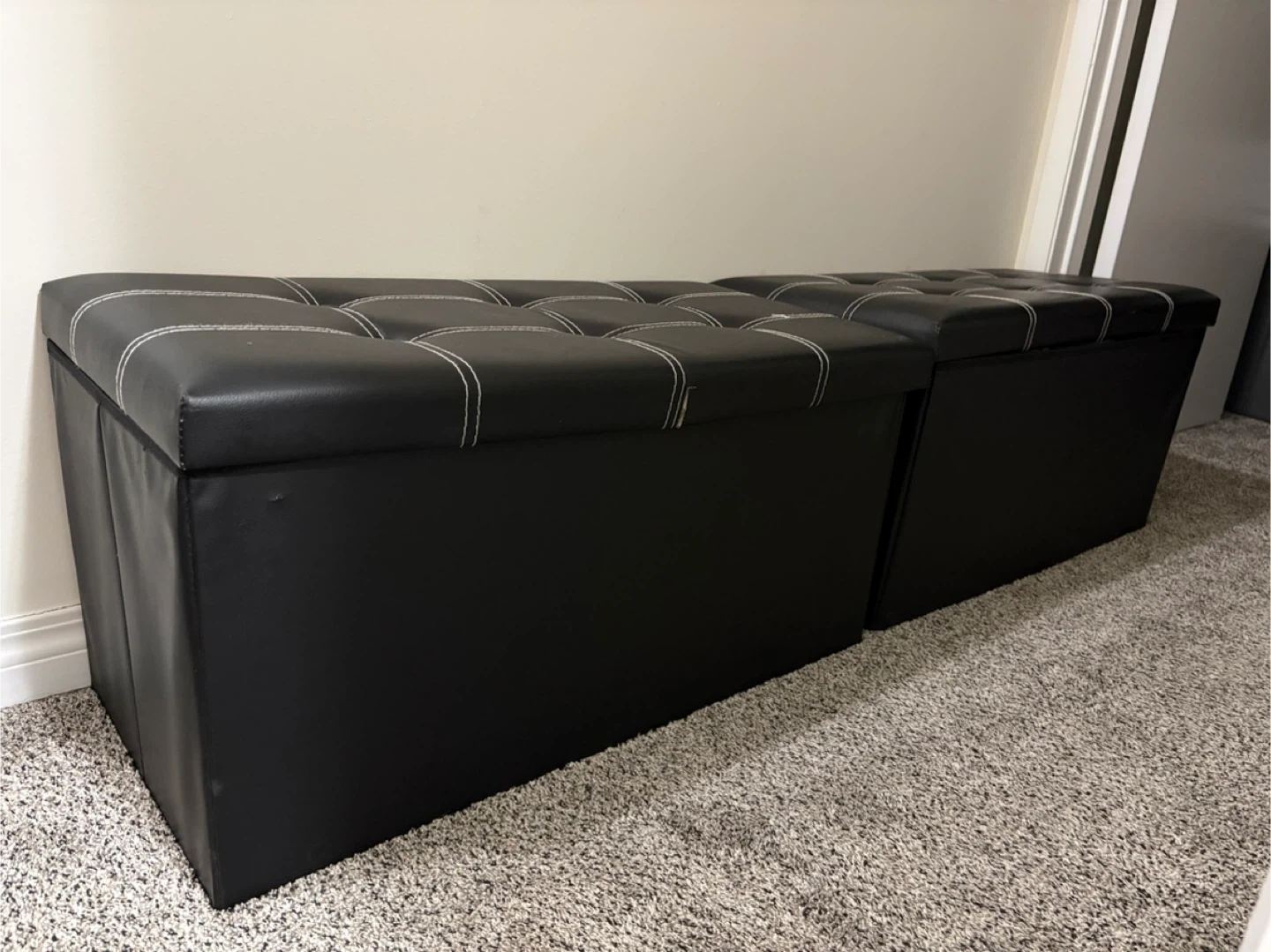 Two black faux leather storage ottomans with white stitching. These ottomans offer hidden storage and can be used as seating or footrests. Great for organizing your living space!
