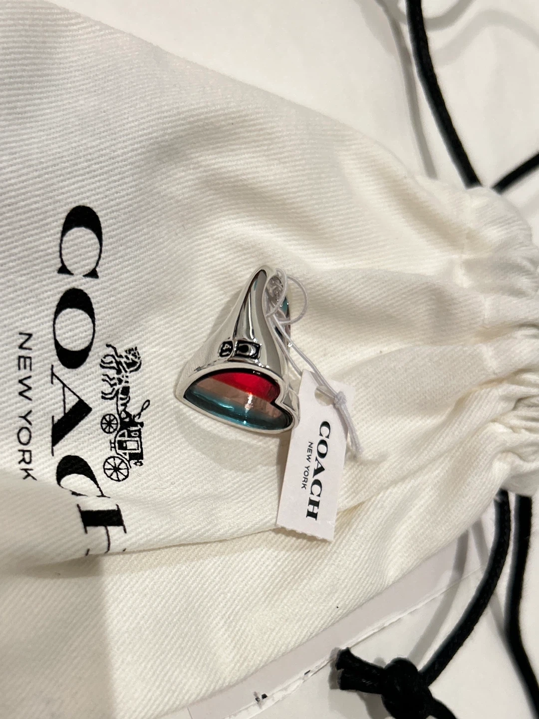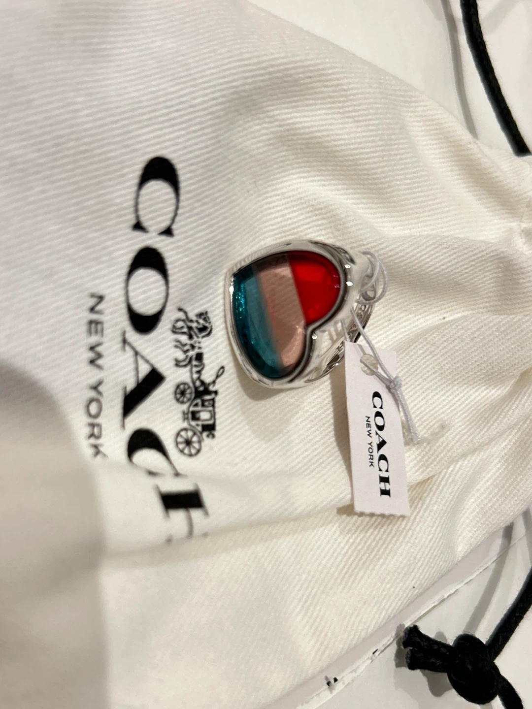 Selling a brand new Coach heart ring! It's still in its original packaging with the tag attached. The ring features a cute heart design with rainbow patterns, with the original Coach pouch / Limited Edition!