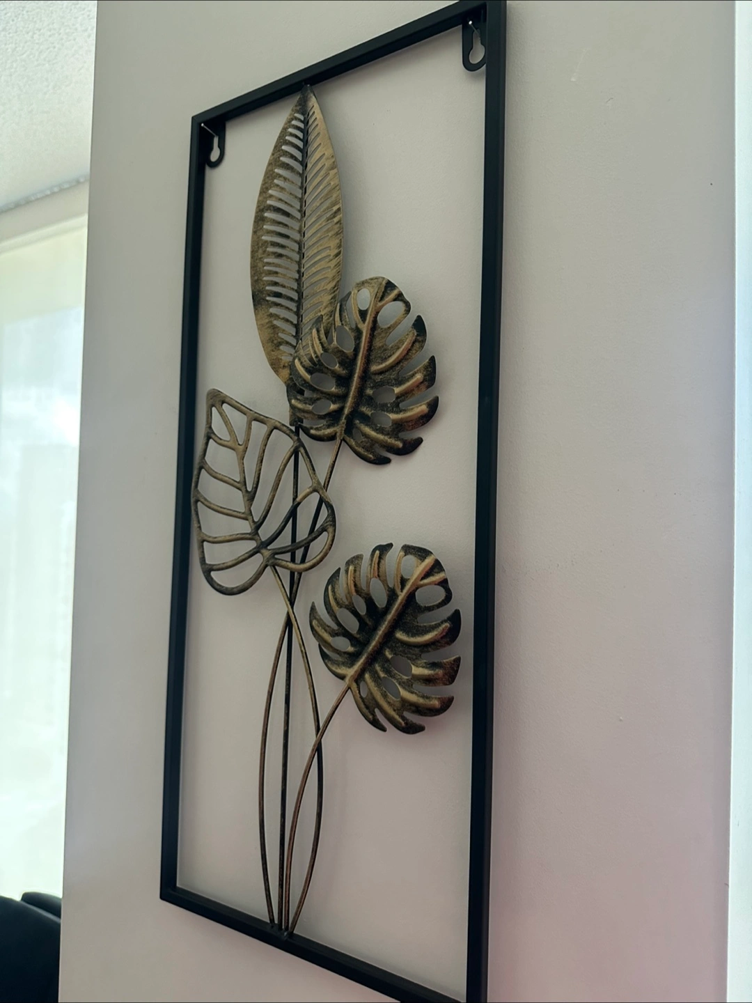 Add a touch of nature to your home with this metal leaf wall art! The black frame and gold leaves create a modern and stylish look. Perfect for any room in the house