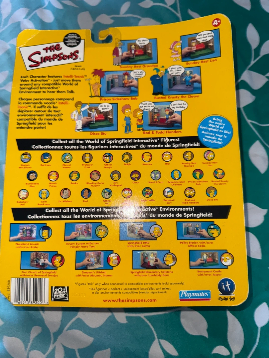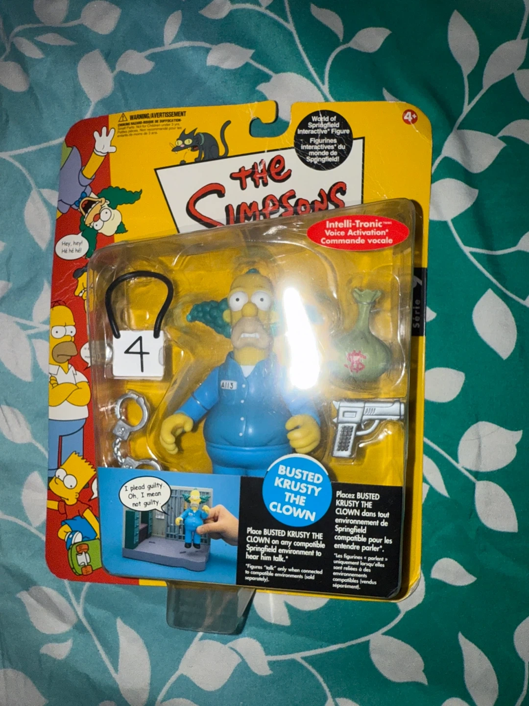 Selling a The Simpsons Busted Krusty the Clown interactive figure. It's part of the World of Springfield collection. The figure is still in its original packaging. It features Intelli-Tronic voice activation and is compatible with any World of Springfield environment. A great collectible for any Simpsons fan!