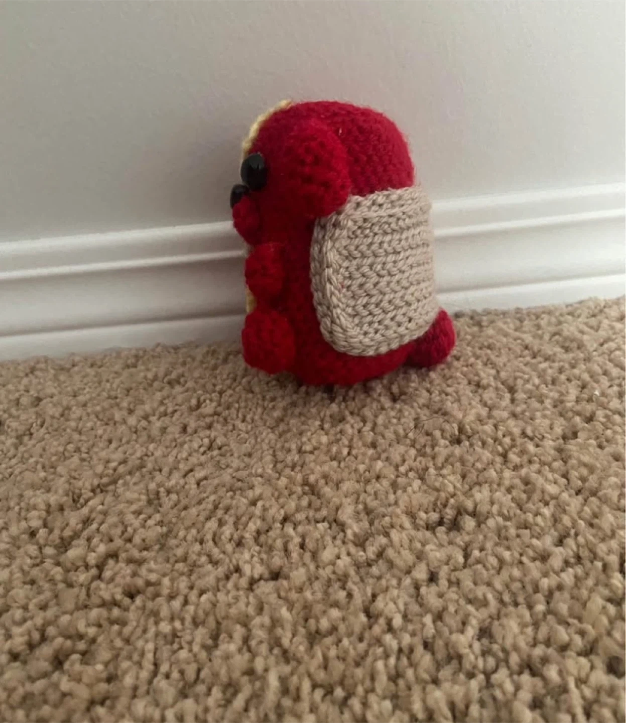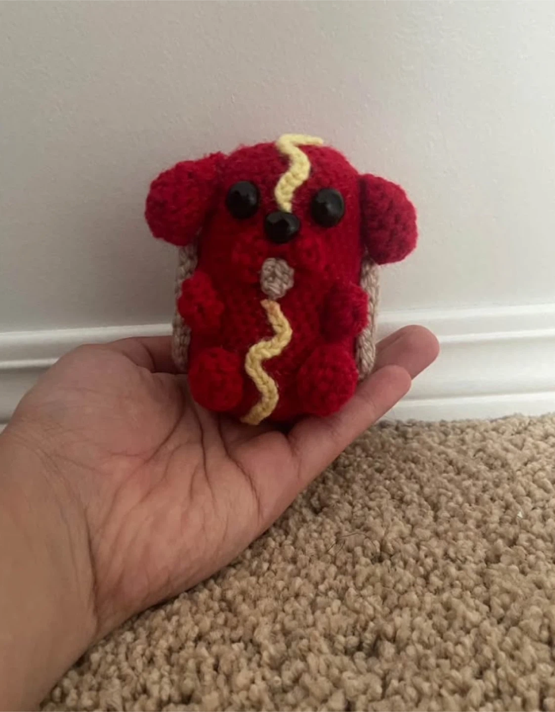 This is a cute, handmade crochet hotdog plushie! It's red with beige and yellow accents. Perfect toy or decoration and I only accept cash no online money please
