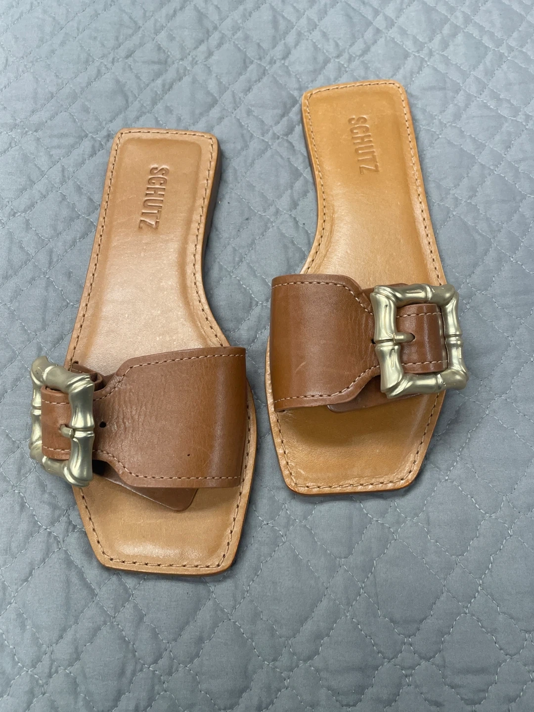 Selling a pair of Schutz brown leather slides. They feature a unique buckle detail and a comfortable, stylish design. Perfect for everyday wear!