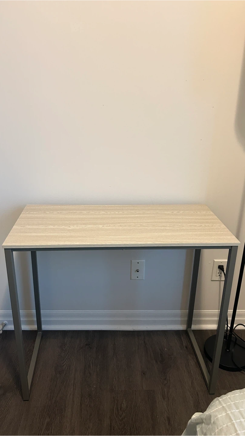 Selling a simple desk with a light-colored wood top and a metal frame. Perfect for a home office or study space
