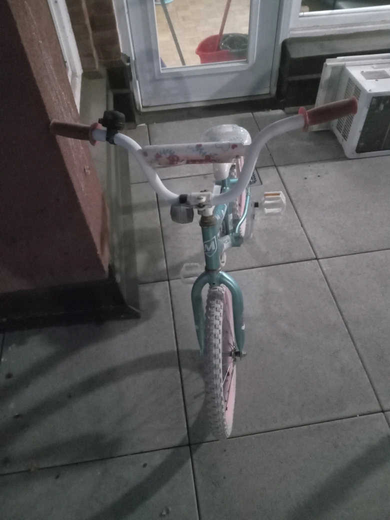 Selling a MoveLo Rozzie kids bike in a cute blue and pink colour scheme! It's perfect for a young child learning to ride. The bike has white tires and a comfortable white seat. Ready for its next adventure!