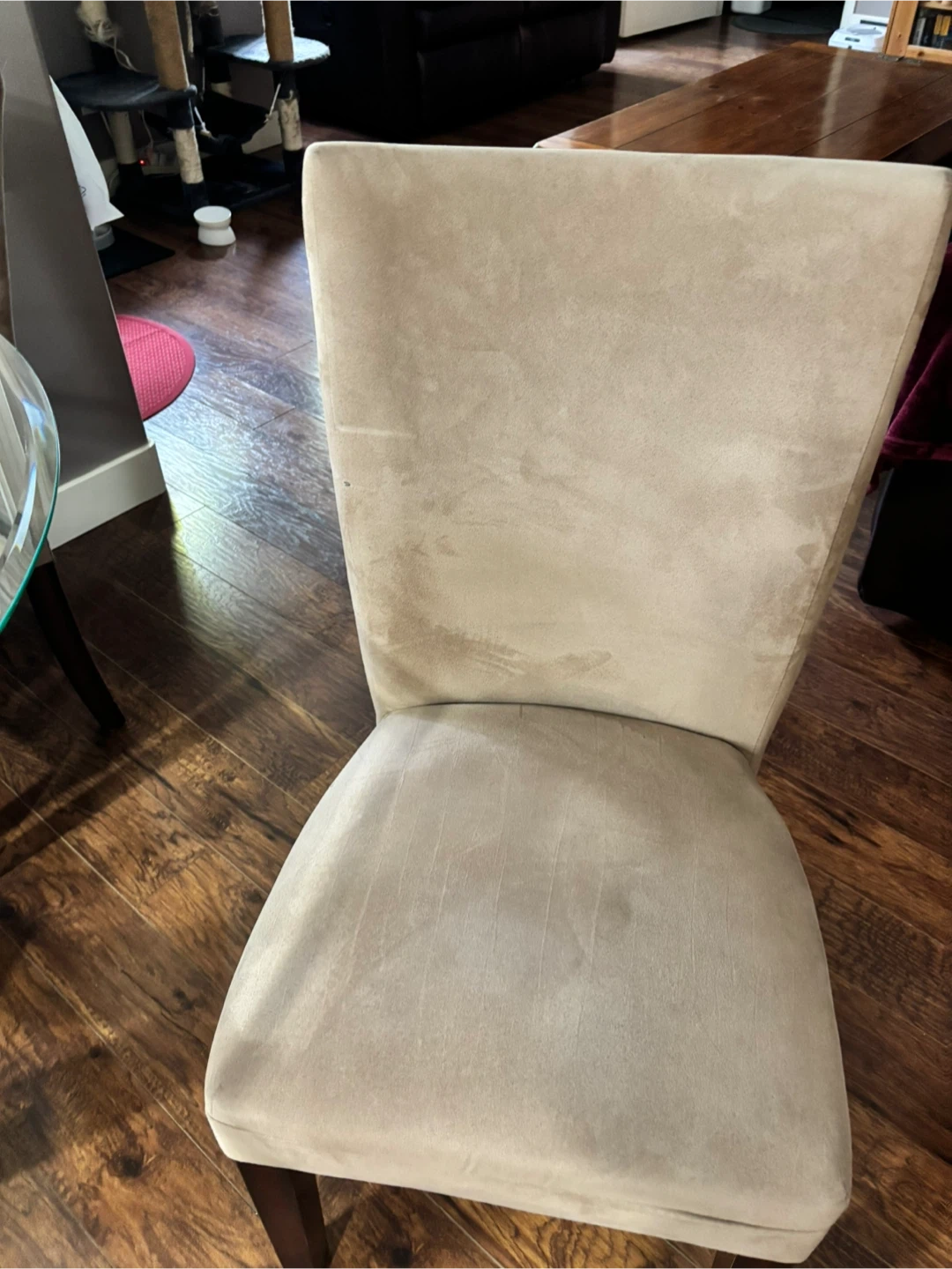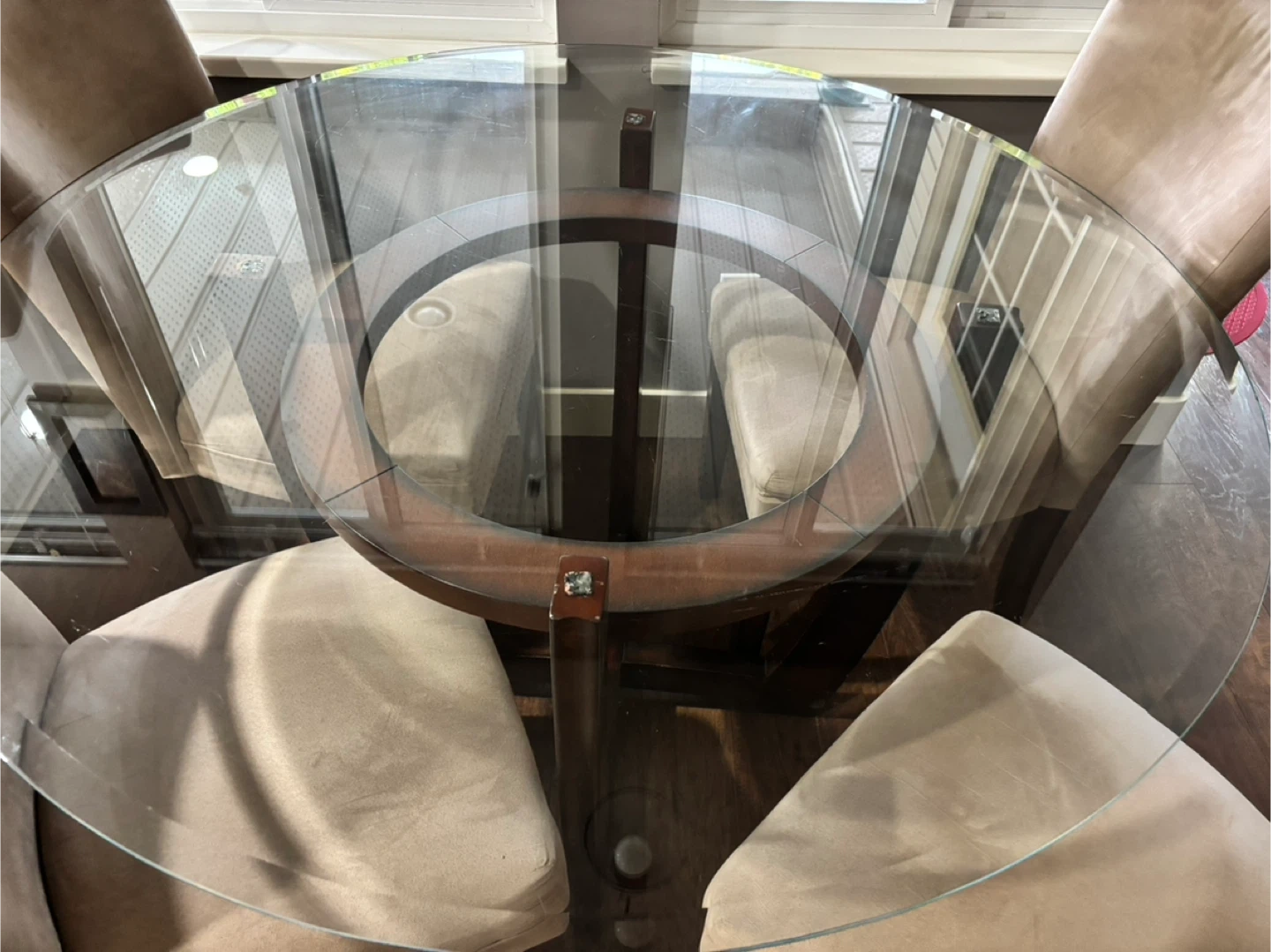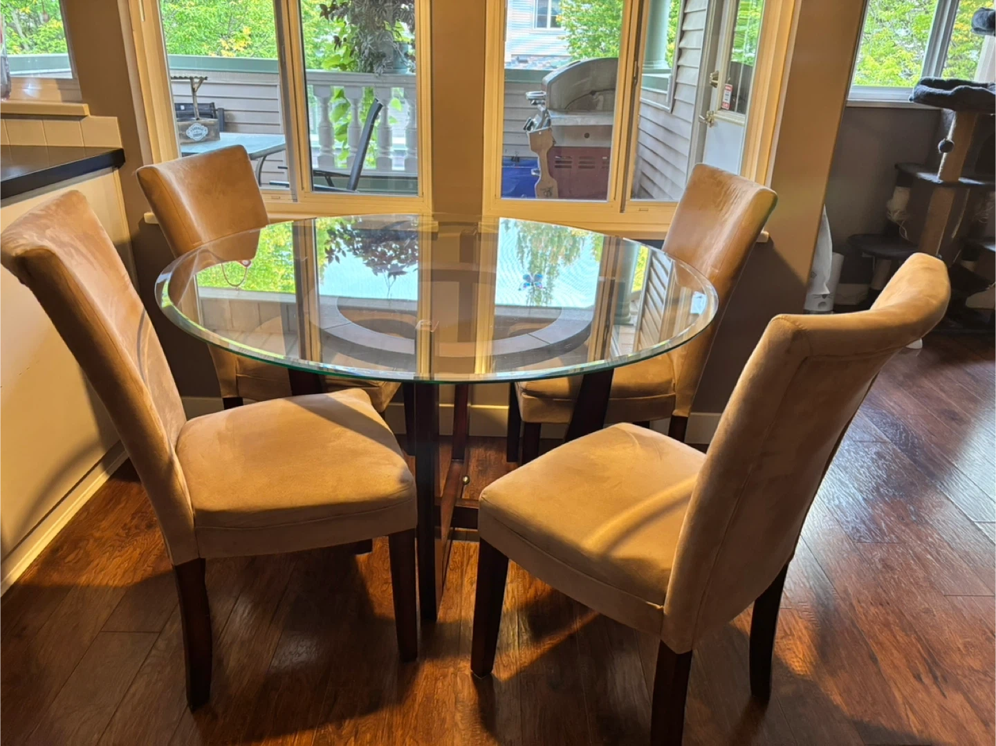 Great glass table and 4 very comfortable chairs. The chairs have a light tan/beige colour and upholstered seats and have been cleaned recently. The table has a dark wood base and the glass is 40” across.