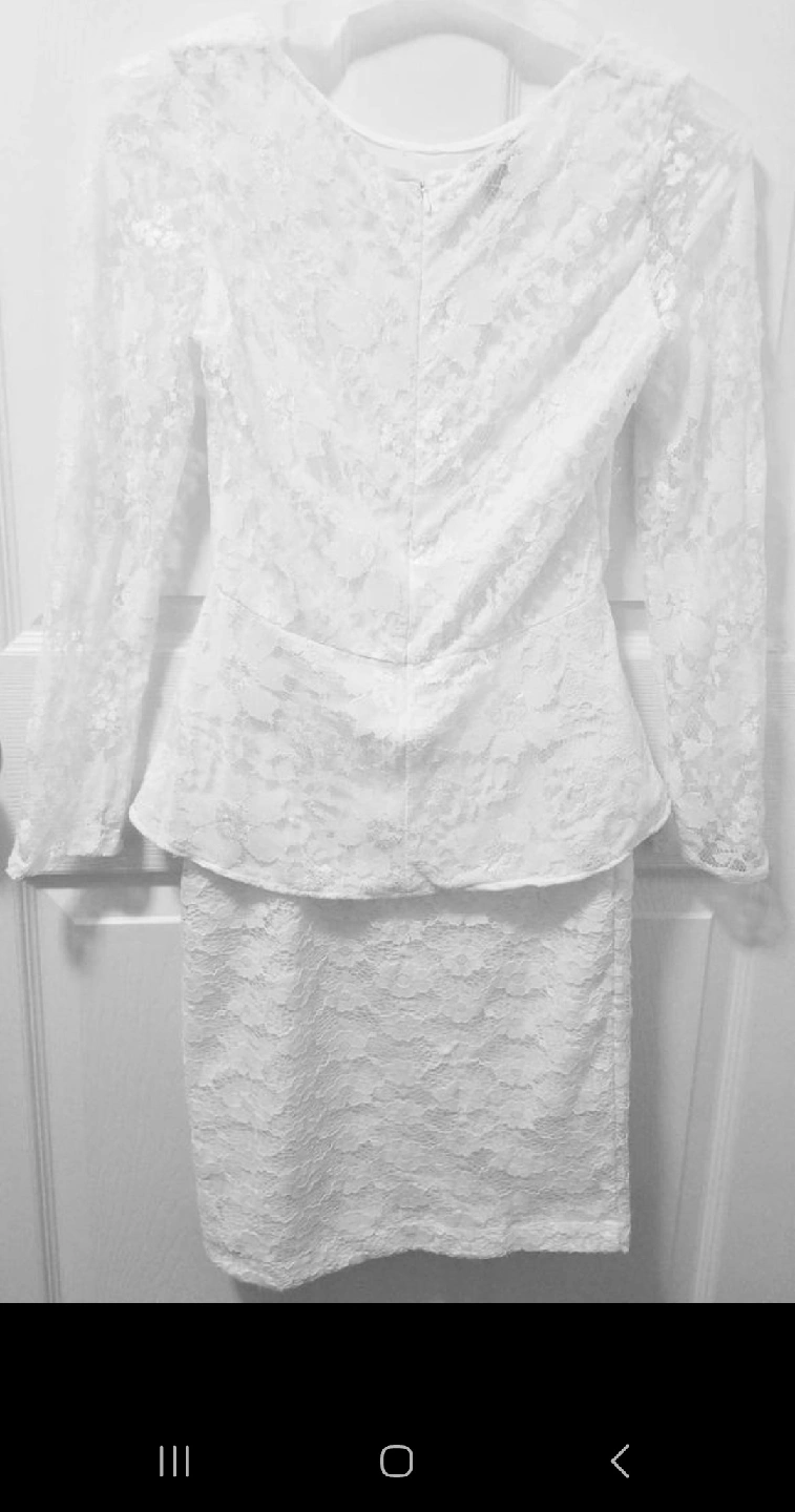This elegant white lace peplum waist long sleeve and matching skirt perfect for special occasions. It is in excellent condition, worn once.