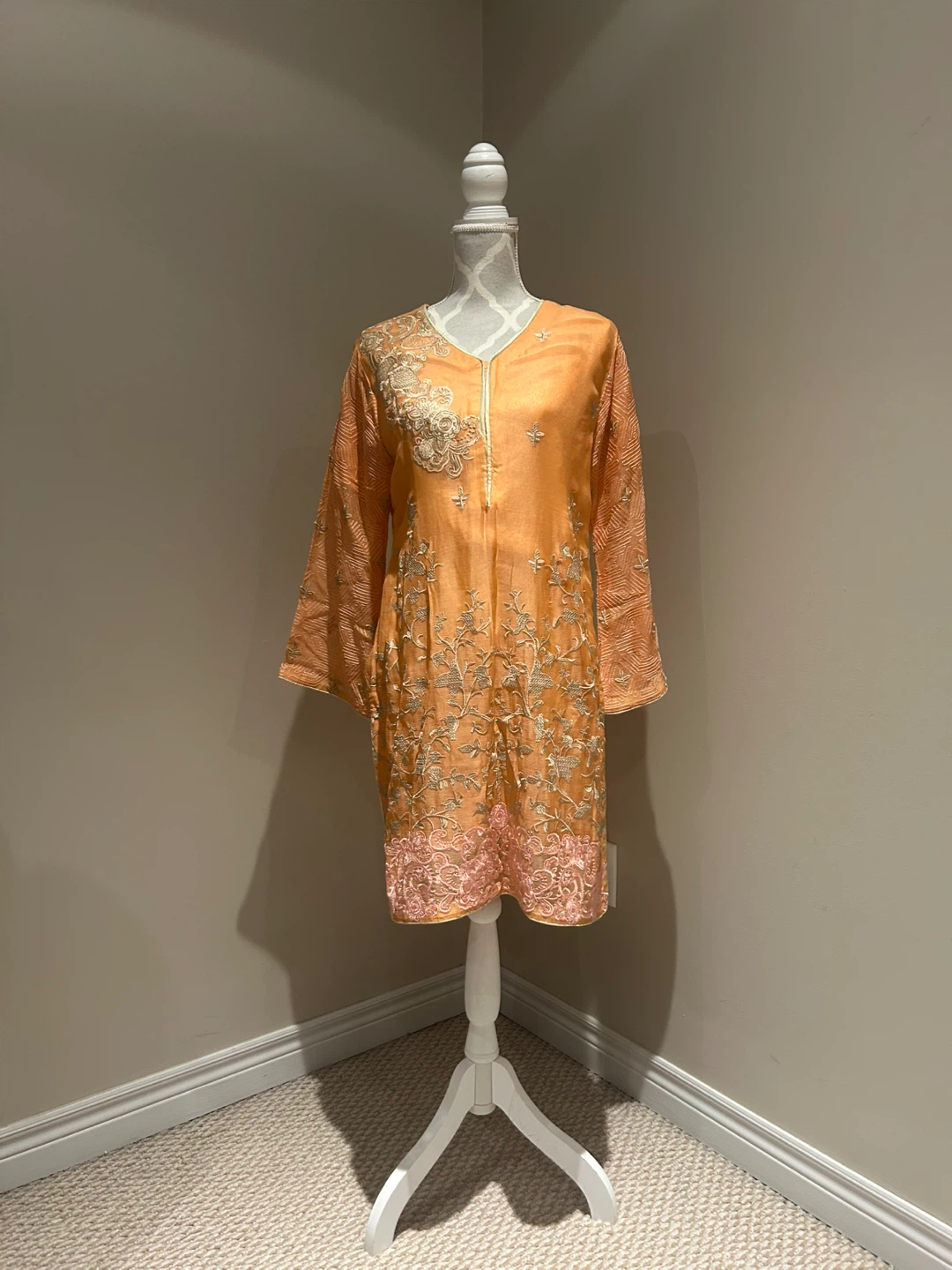 Selling a beautiful peach coloured Kurti with matching pants. The kurti features delicate embroidery and a flattering silhouette. Perfect for special occasions or everyday wear!