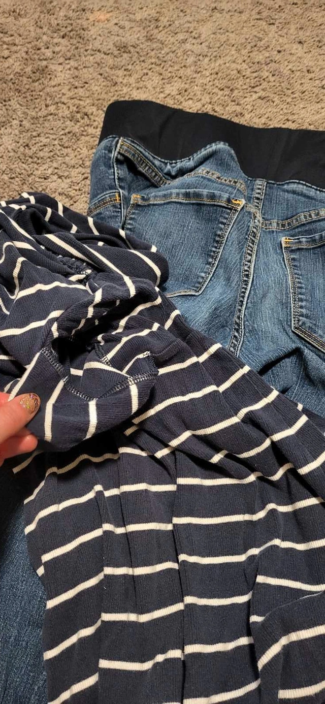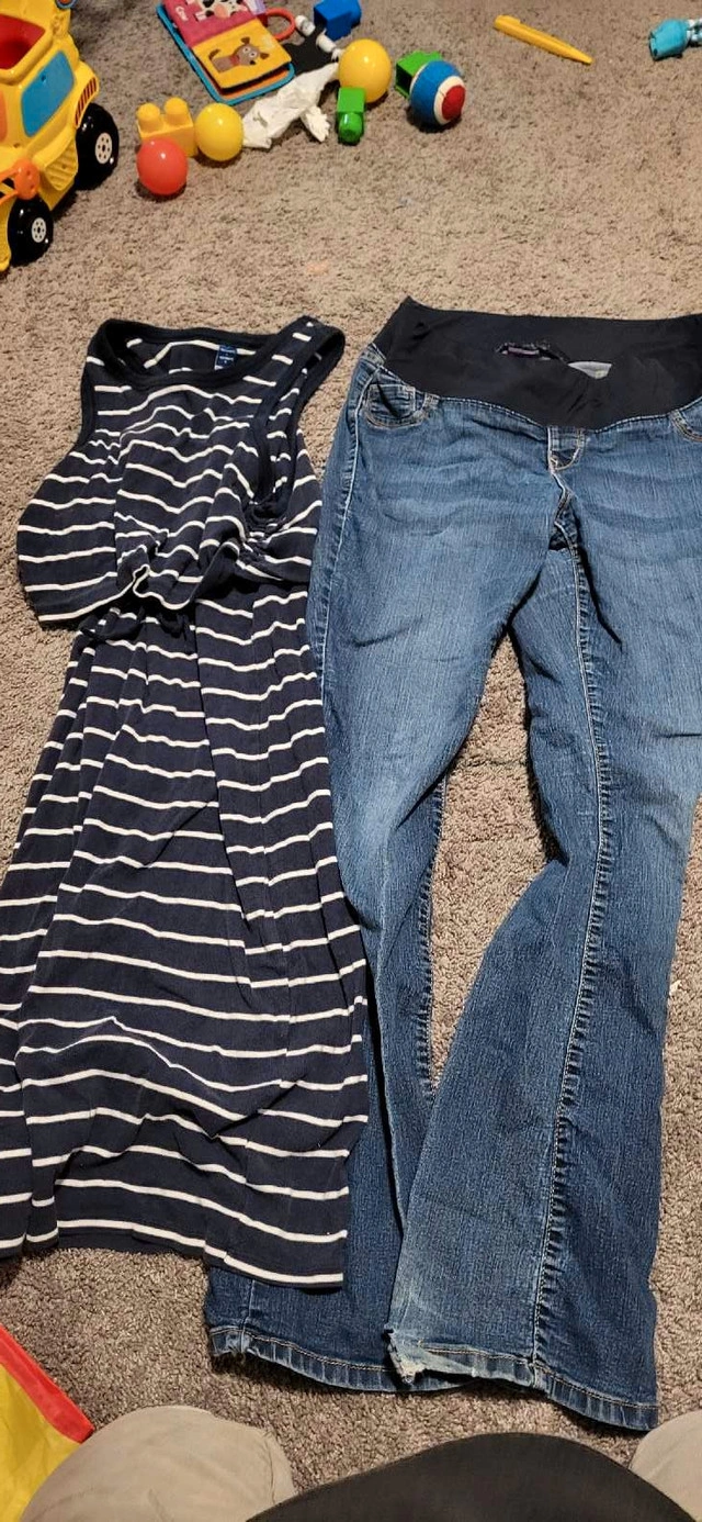 Size L Old Navy Maternity/Nursing dress. EUC. Old Navy Size 8 maternity pants. A bit of fraying at the bottom on the leg but otherwise good condition. Pickup South St. B or Exchange.