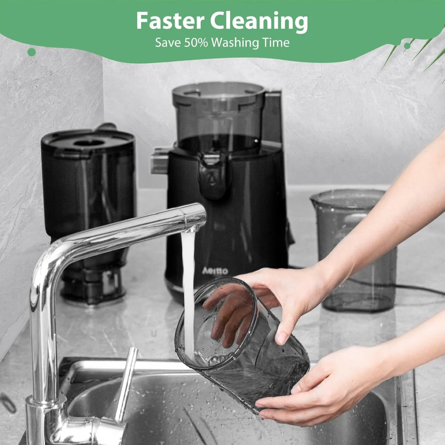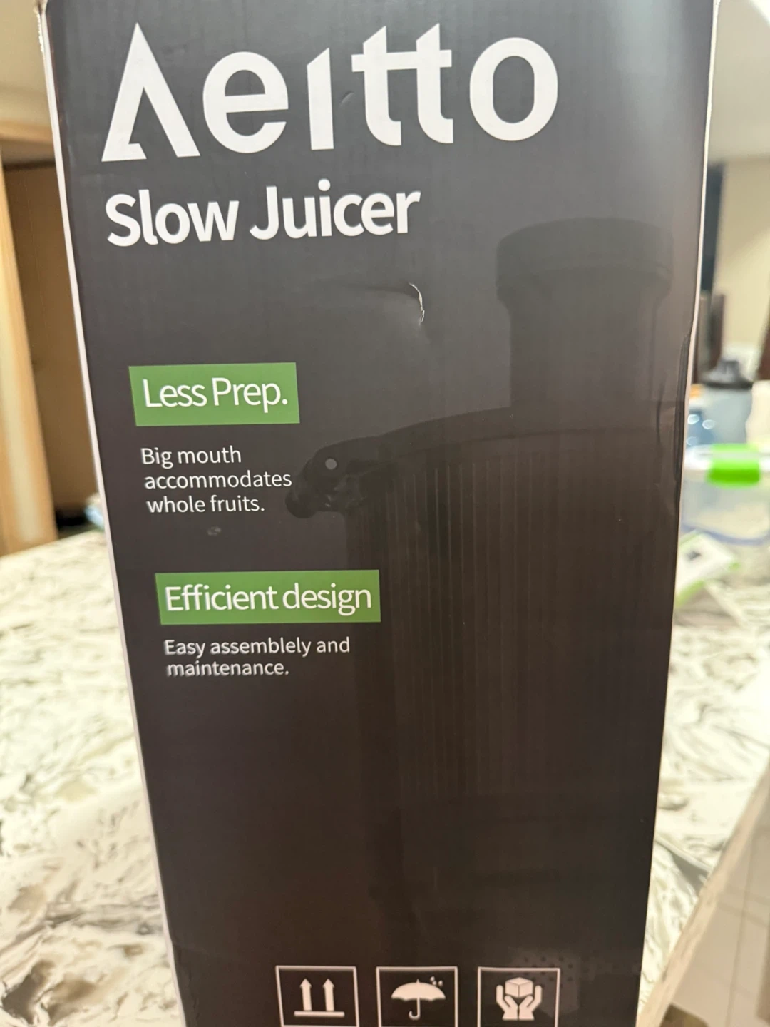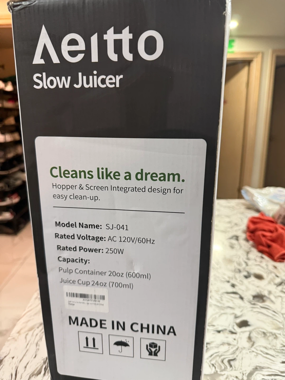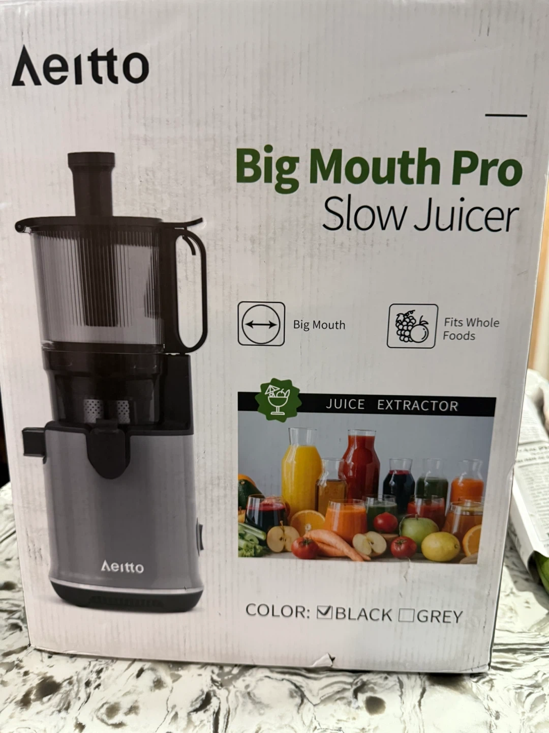 43I'm selling a brand new Aeitto Big Mouth Pro Slow Juicer in black! It features a 250W high power motor for efficient juicing with lower noise. Key features include: - Efficient juicing - Reduced clogging - Lower noise - Oversized feed chute (5.3 inch) to reduce preparation time - High juice yield, providing you with purer juice (up to 99%) Dimensions: - 16.97 inch height - 8.17 inch width