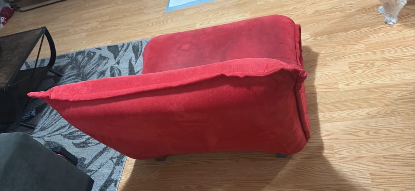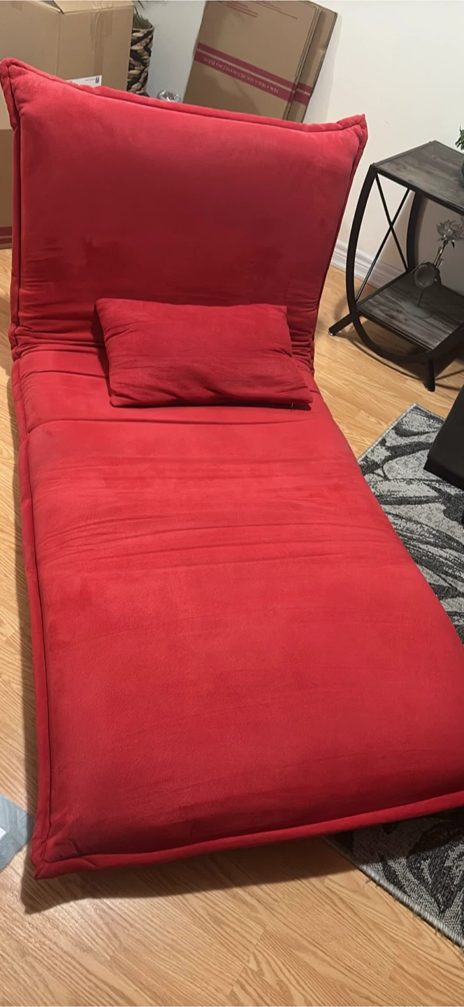 Selling a comfy red folding floor chair that can also be used as a bed! It comes with a matching pillow. Great for small spaces or extra seating