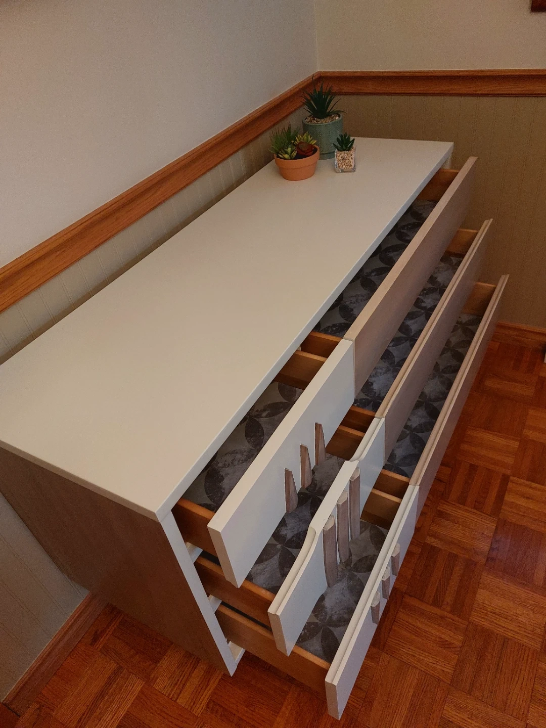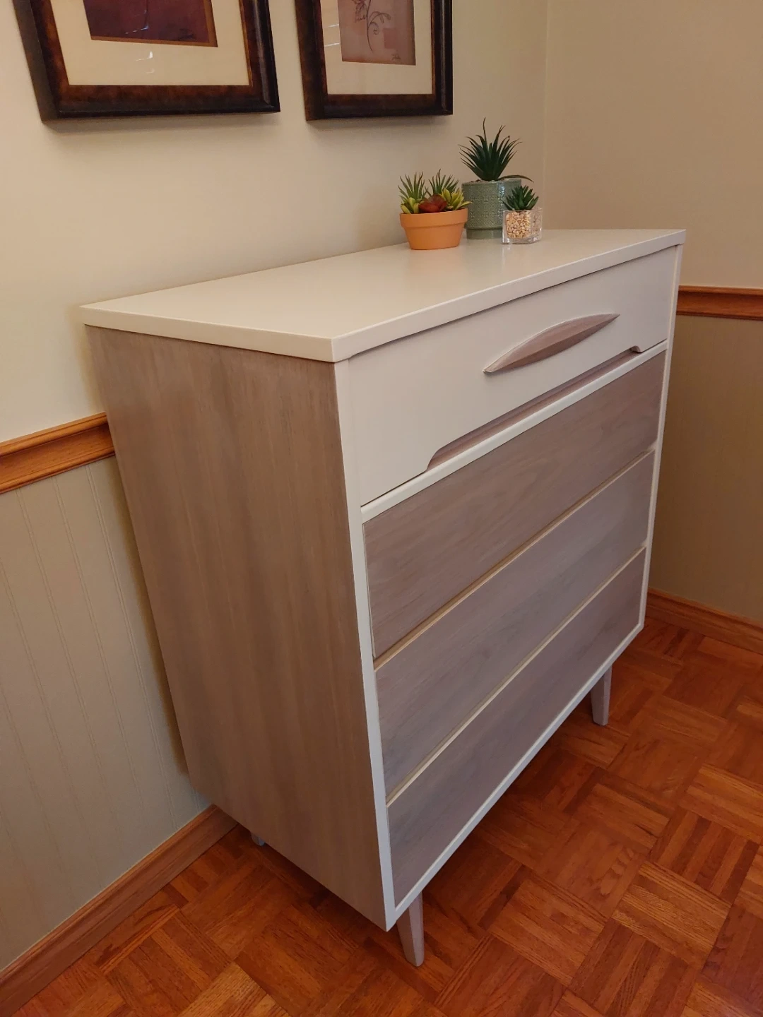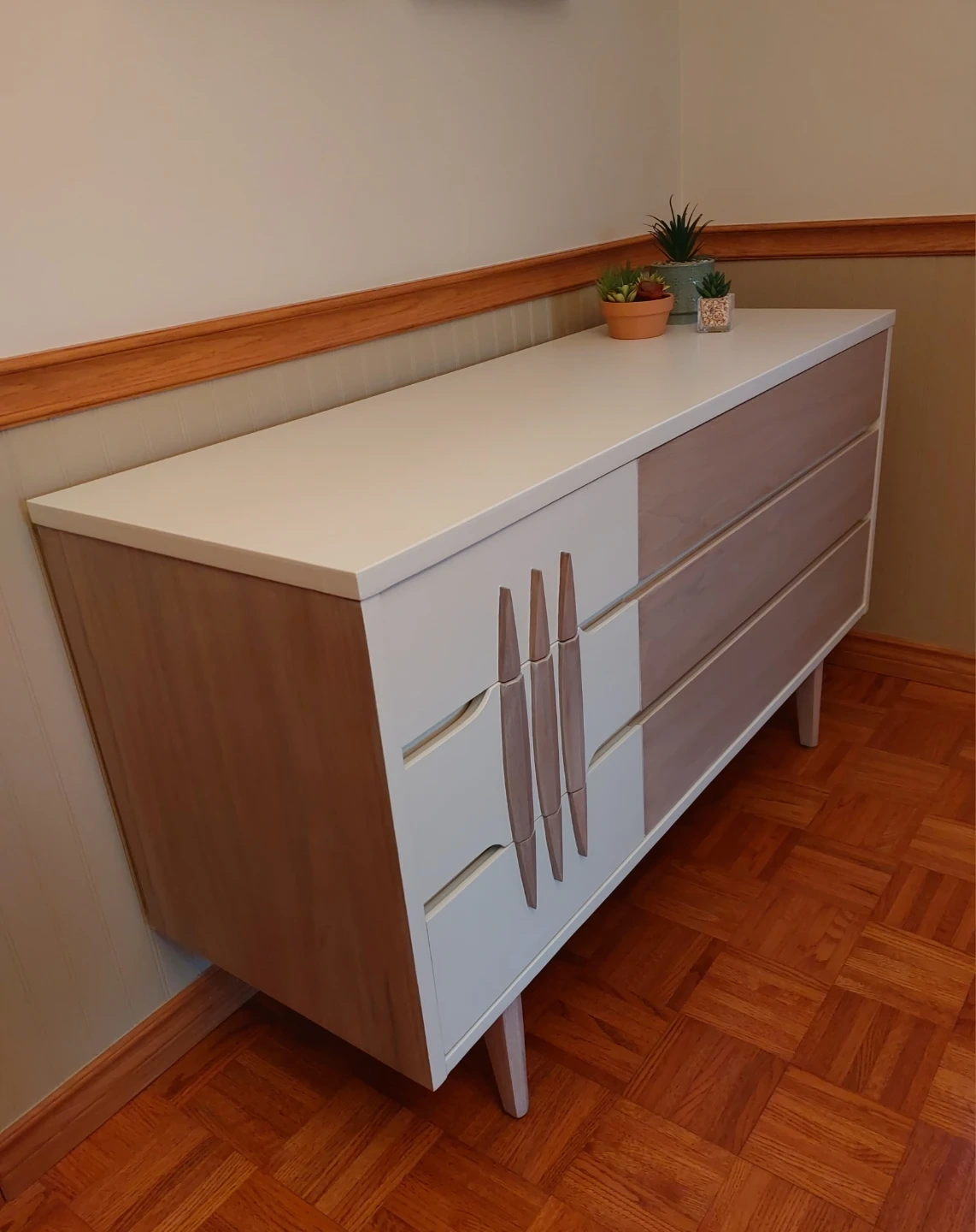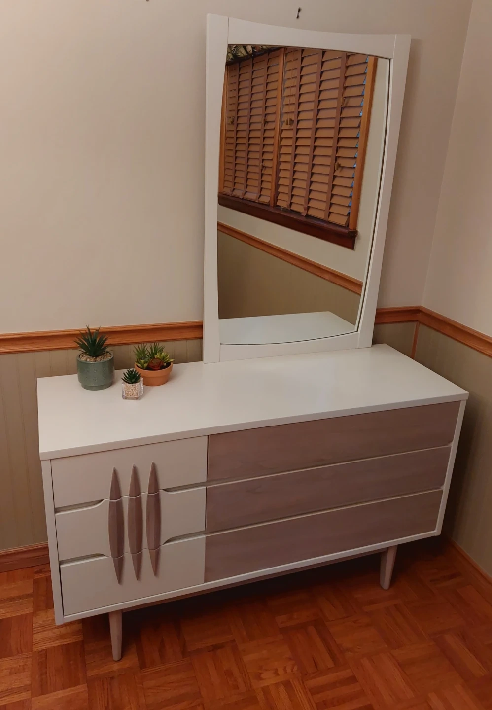 This beautifully redesigned and refurbished MCM, “Kroehler” dresser set will fit into any décor. Painted in the colour “white sand” and with a paint wash of the same colour. Top coated in a satin finish for extra durability.