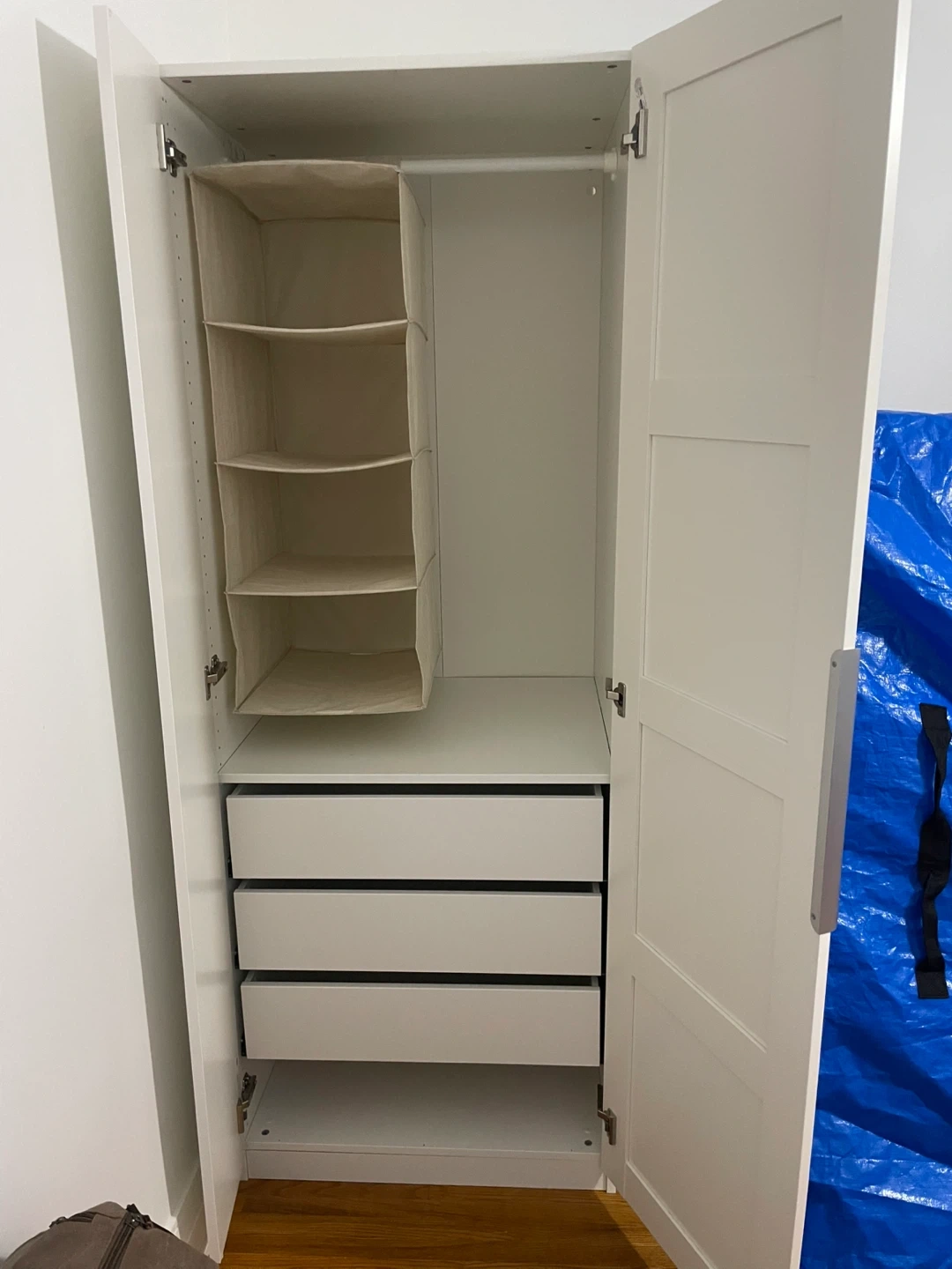 Selling a white IKEA PAX wardrobe. It's in great condition and ready to organize your space! Inside, you'll find three drawers and a hanging organizer. Perfect for adding extra storage to any room