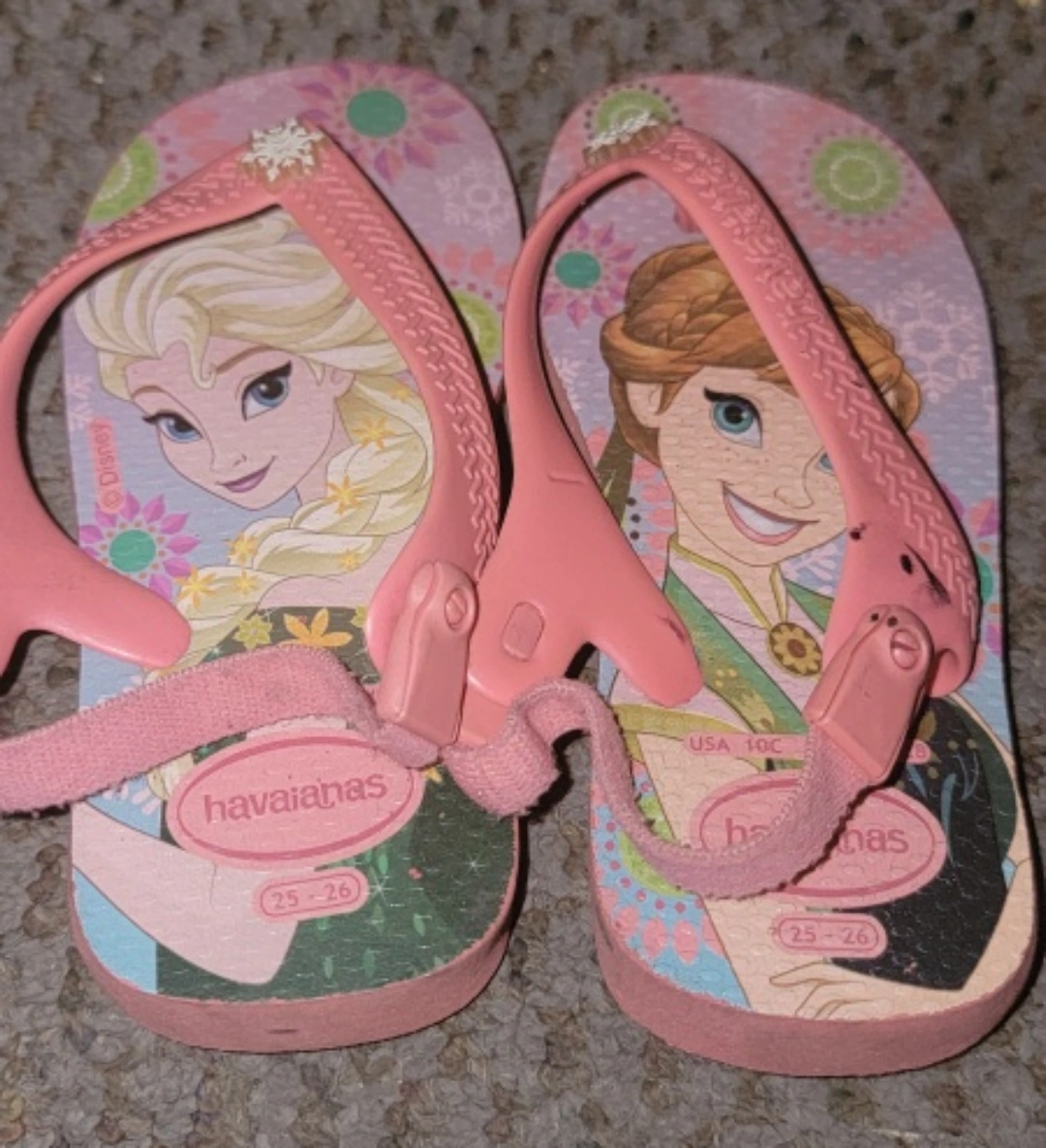 These adorable Havaianas sandals feature a fun Frozen design with Elsa and Anna! They are in size 25/26, perfect for little feet. They show some signs of wear, but still have lots of life left for your little one to enjoy! pick up location Royal York and Mimico