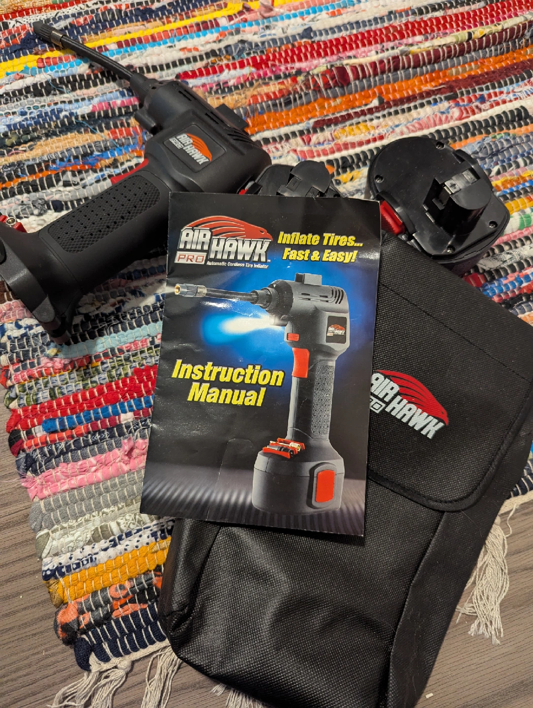 Selling an Air Hawk Pro automatic cordless tire inflator! It comes with the instruction manual, battery, and carrying case. It's perfect for inflating tires quickly and easily!
