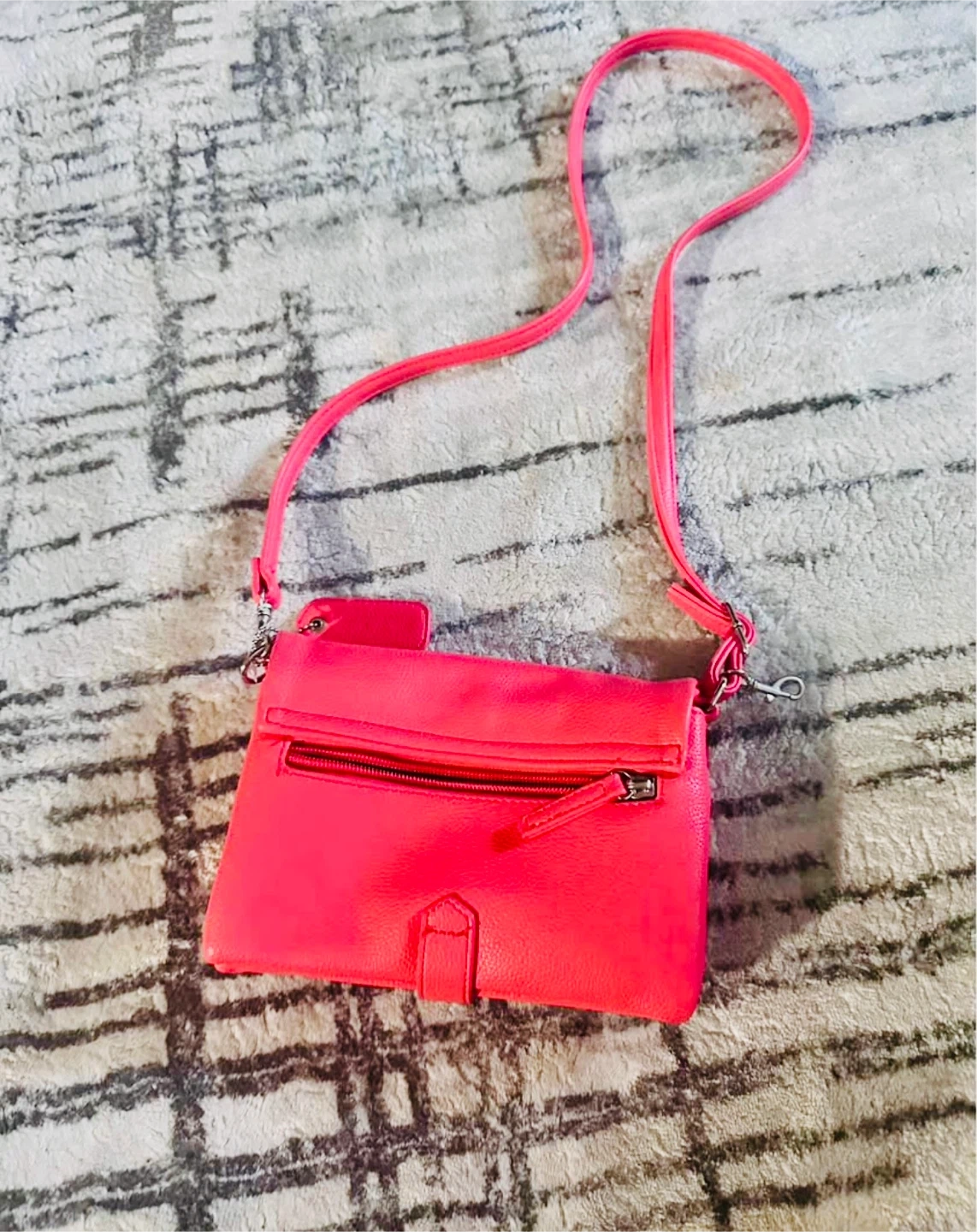 Selling a cute hot pink crossbody bag! It's in great condition and perfect for carrying your essentials. The bag features a mirror inside and a zipper pocket on the back. It's a stylish and convenient accessory!