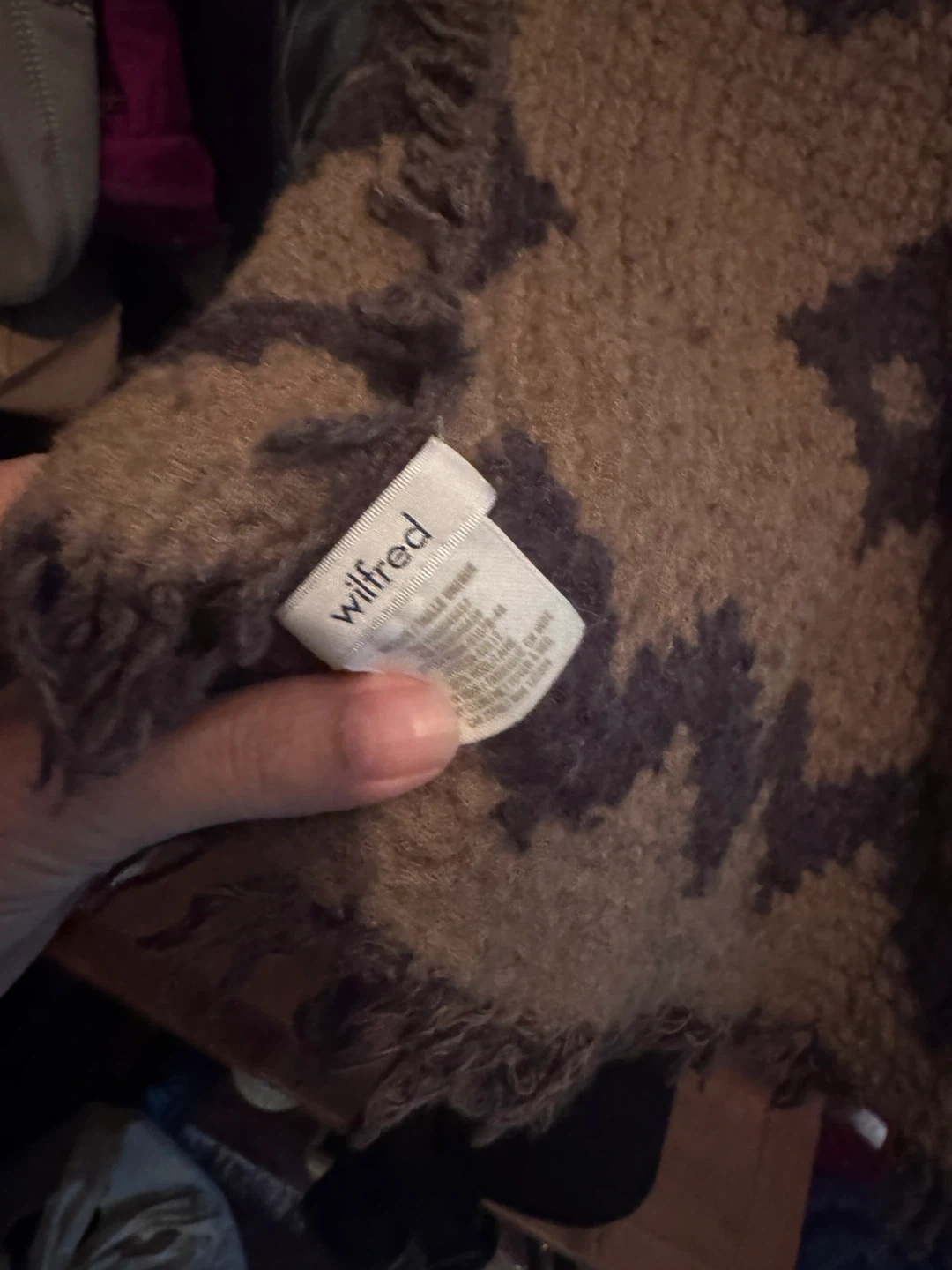 81Cozy Wilfred scarf with a brown patterned design! It's in great condition and ready to keep you warm
